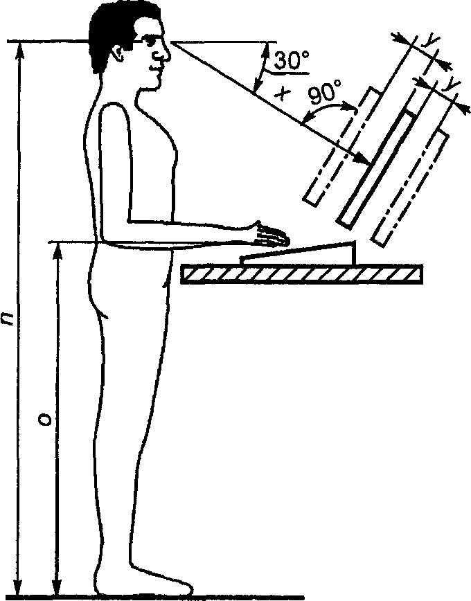 При проектировании или выборе рабочих мест с видеодисплеями для использования терминала в позе стоя, как и в позе сидя, имеется лишь относительно небольшое количество учитываемых внешних размеров тела.