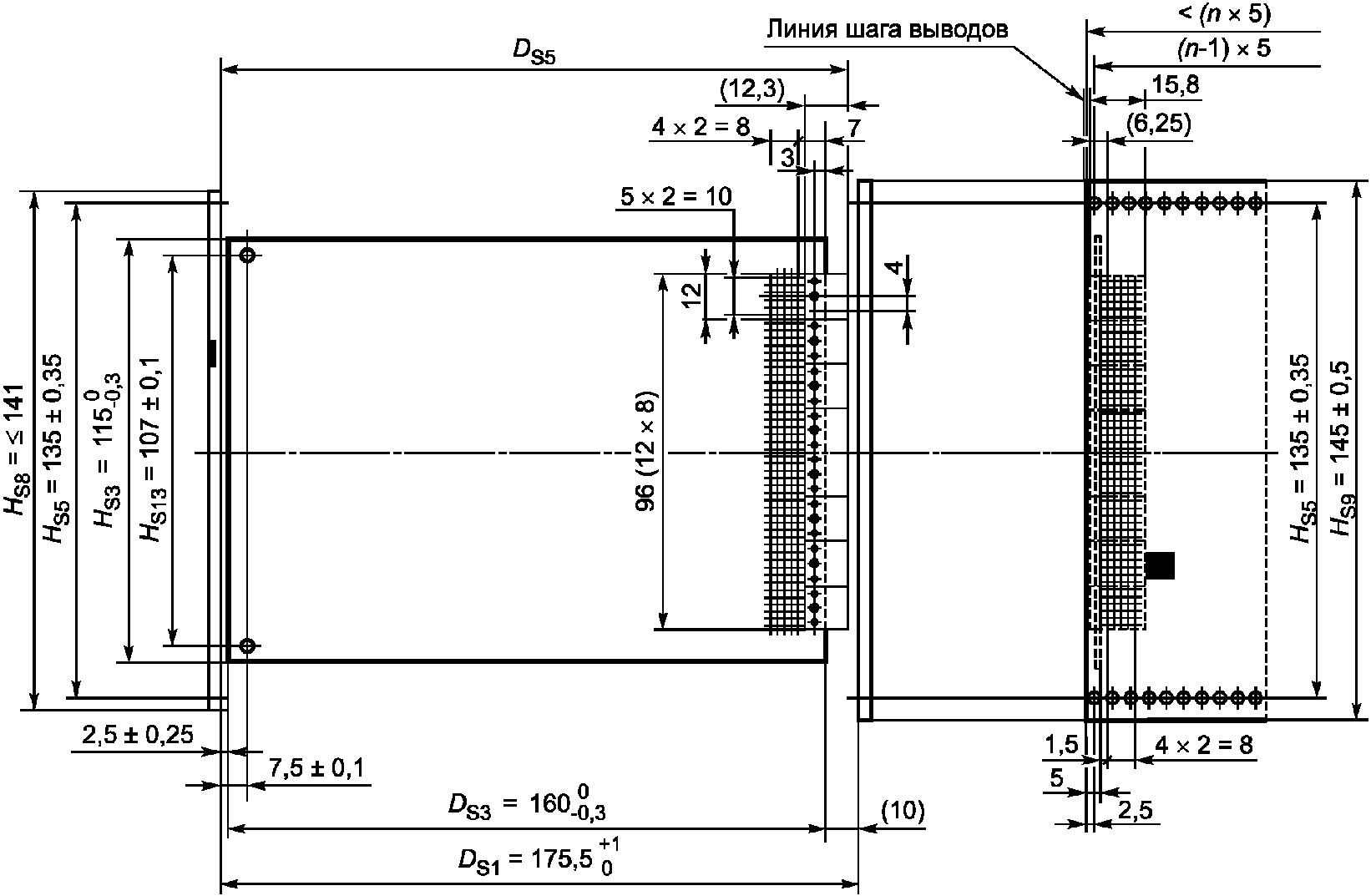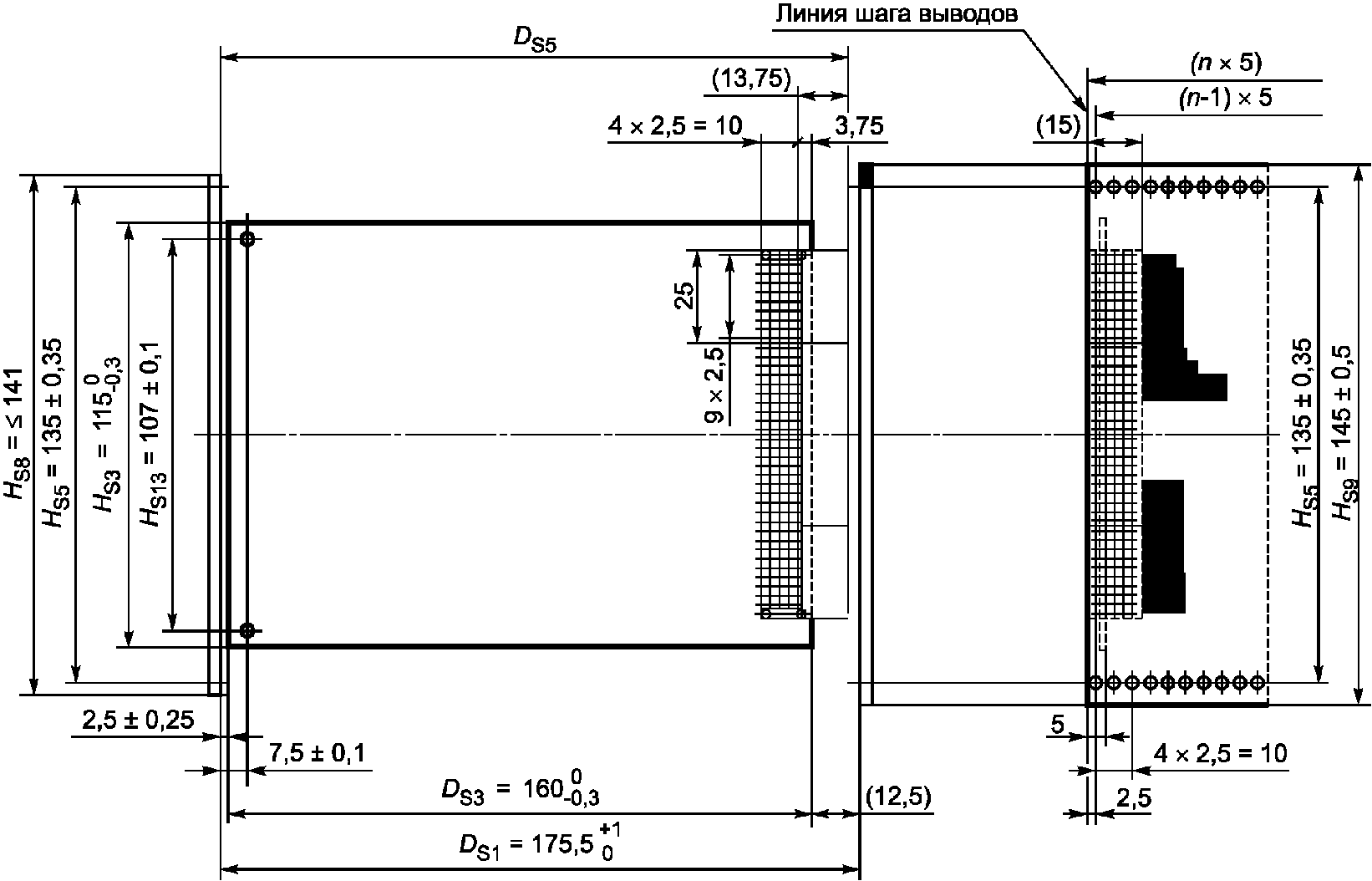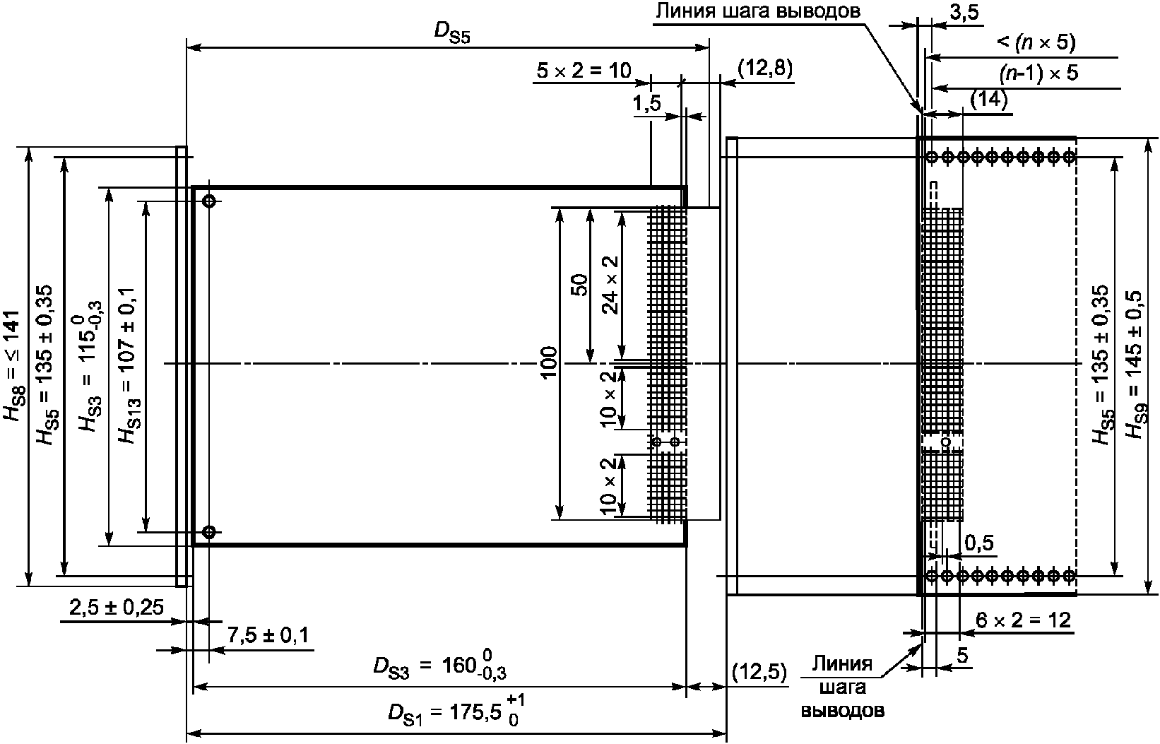 где DS - координационный размер блочного каркаса по глубине, DS = n x mp1; DS1 - глубина проема блочного каркаса для вставных блоков; DS2 - глубина блочного каркаса до задней плоскости закрепления для опоры разъема блочного каркаса или изолирующей прокладки, DS2 = DS1 - 1,5 мм; DS3 - глубина печатной платы, зависит от разъема; DS4 - общая глубина вставного частичного каркаса или вставного блока типа рамки, зависит от разъема; DS5 - глубина вставного блока, контрольный размер, зависит от разъема. |