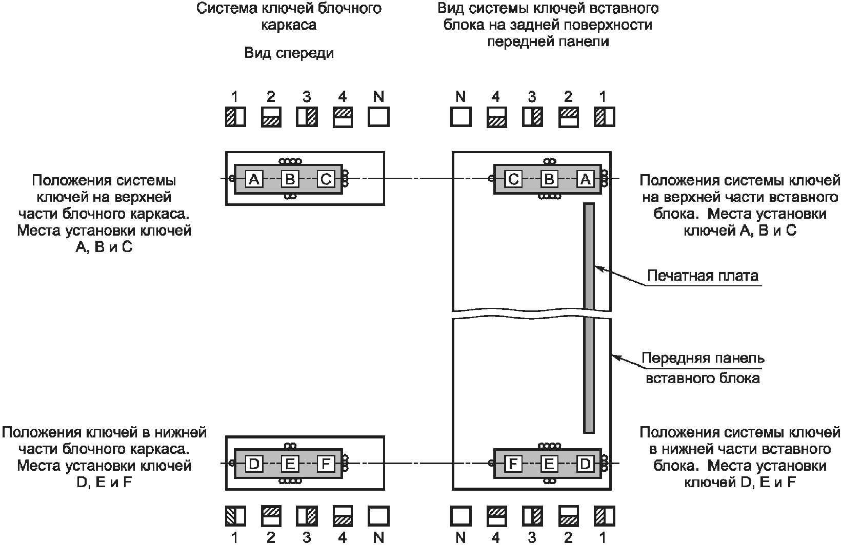Для печатных плат вставных блоков определены два типа проводящих элементов для ЗЭР. Проводящий элемент одного типа проходит по всей плате, а проводящий элемент другого типа укорочен (см.