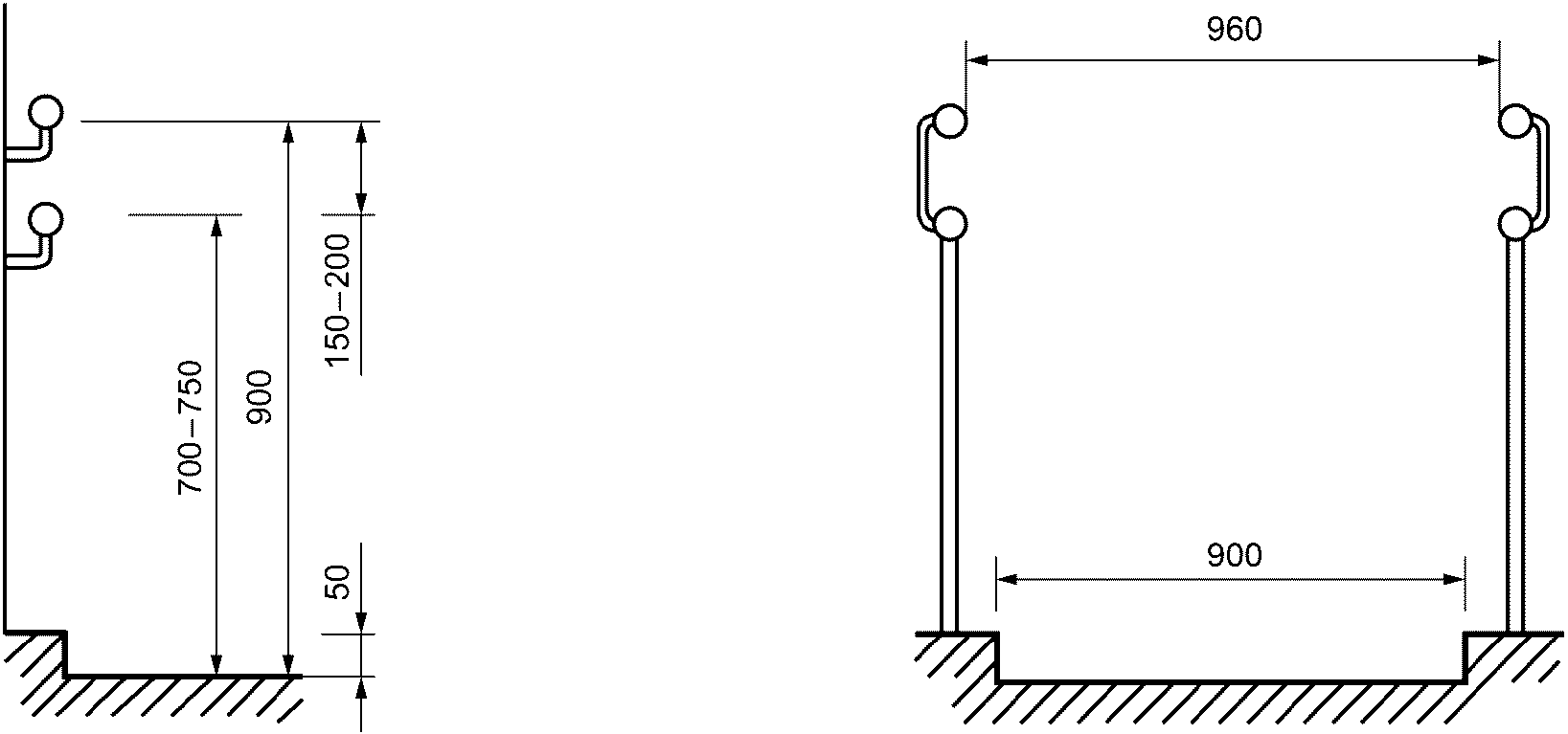 При этом горизонтальный участок поручней ванны (для парных поручней - участок верхнего поручня) должен располагаться на высоте от 850 до 900 мм от уровня пола ванны, а горизонтальный участок нижнего парного поручня - на высоте не более 200 мм от верхней кромки ванны.