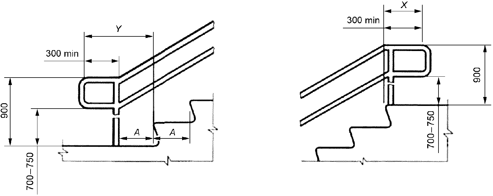 5.2.7.2 Лестничные поручни должны иметь с обеих сторон участки, выходящие за пределы длины лестничного марша - вверху как минимум на 300 мм и внизу как минимум на 300 мм с прибавлением глубины одной ступени лестницы А, как показано на