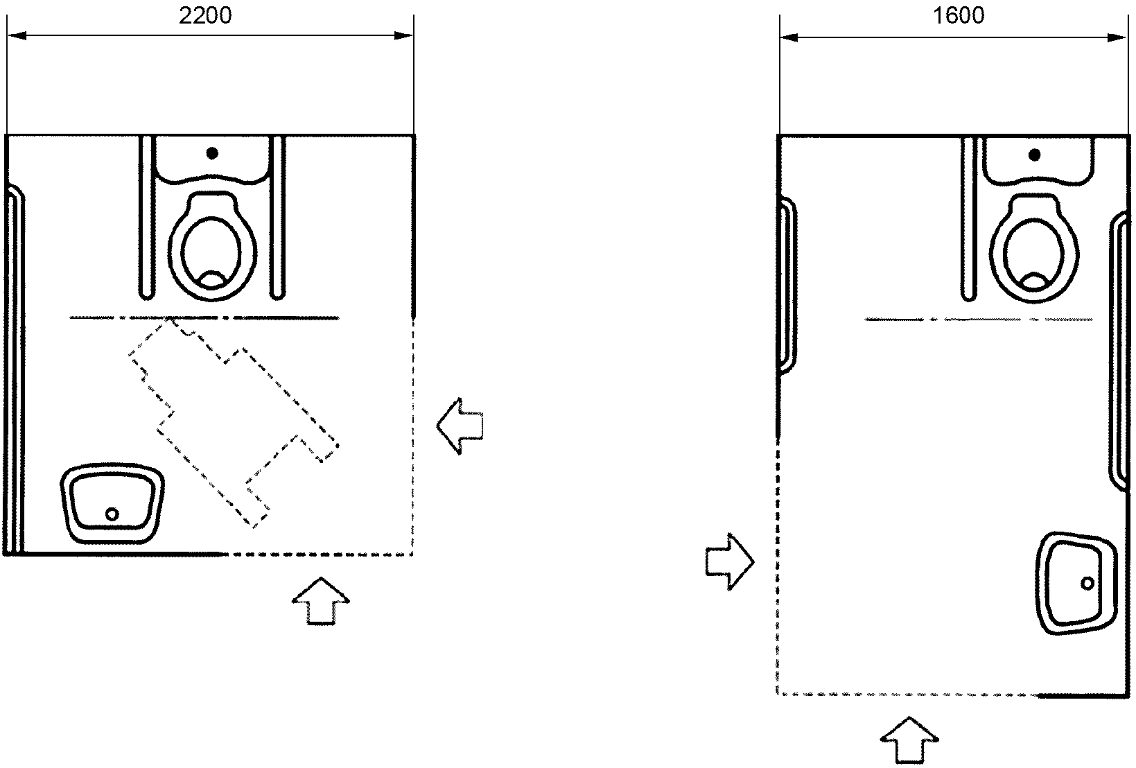 5.2.8.4 В случае, если в туалетной комнате предусмотрен боковой подступ инвалида в кресле-коляске к унитазу, то при установке двух боковых поручней один из них, расположенный со стороны подступа к унитазу, должен быть поворотным или откидным