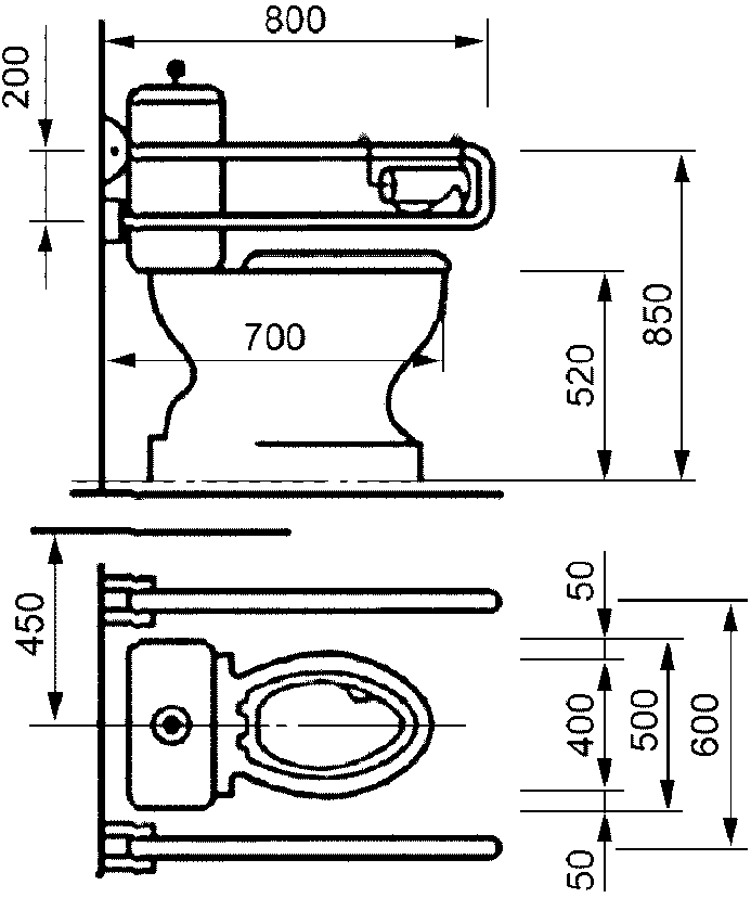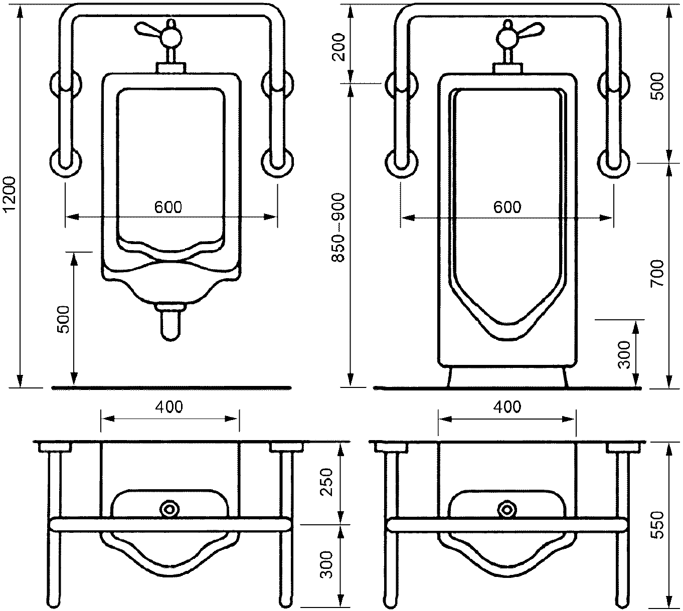 б) два горизонтальных парных поручня круглого сечения, консольно прикрепленных к задней стене туалетного помещения симметрично с обеих сторон унитаза, то длина каждого из этих поручней должна быть не менее 650 мм, а размещают их на высоте от 800 до 850 мм от поверхности пола и на расстоянии 600 мм друг от друга.