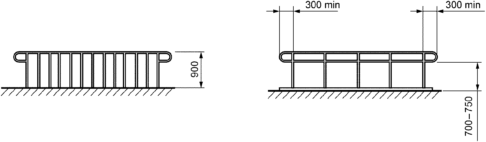 5.2.13.2 Поручни платформ подъемников должны иметь свободные участки длиной не менее 300 мм. Нижний парный поручень должен находиться над платформой на высоте не менее 750 мм, а верхний - на высоте не более 900 мм.