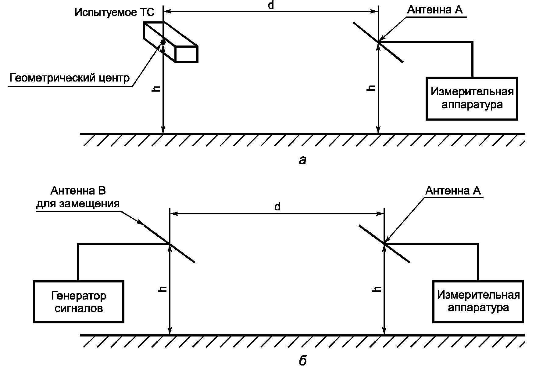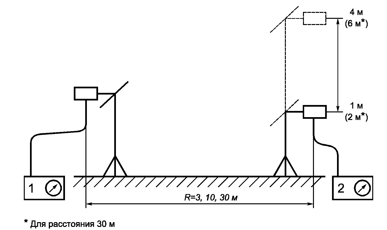 Д.2. Измерения проводят с использованием широкополосных антенн. Измерительное расстояние измеряют между центрами поворотной платформы и антенны. Приемную и передающую антенны располагают так, чтобы их элементы были параллельны друг другу и перпендикулярны оси измерения.