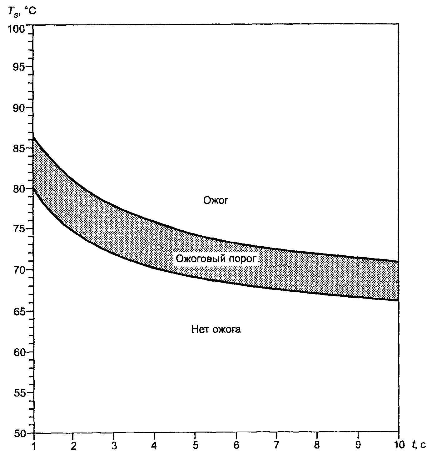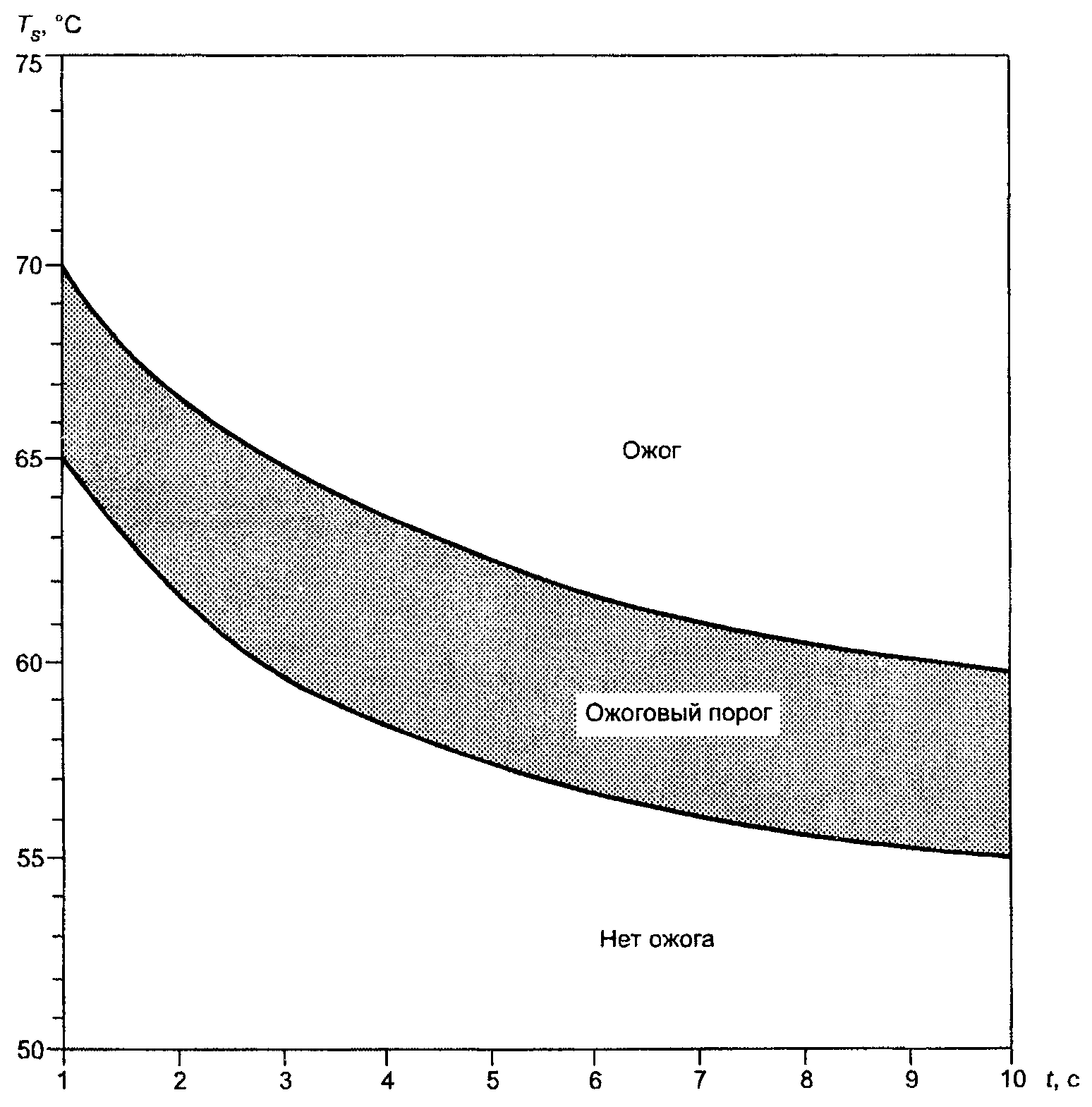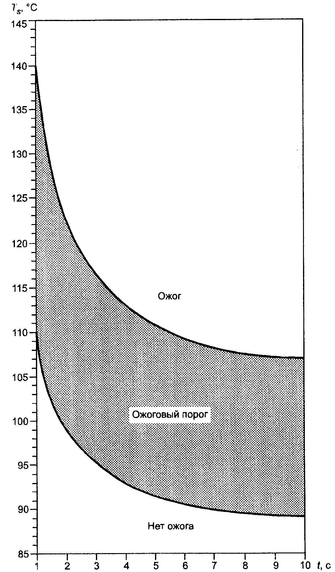 Примечание. Ожог зависит от температуры кожи и продолжительности контакта. Связь между температурой кожи и продолжительностью контакта исследована и приведена в