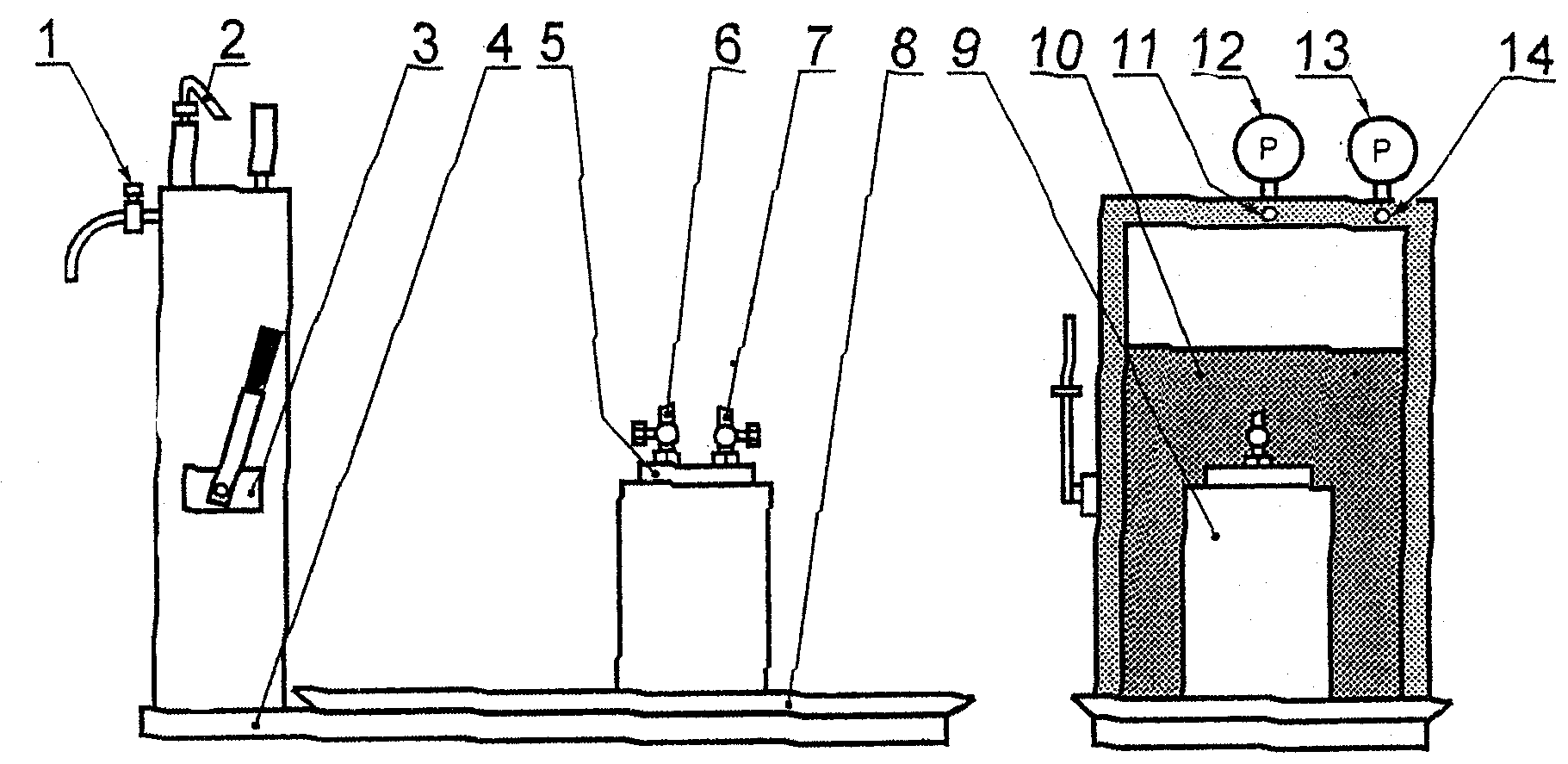 9 - испытываемая тара; 10 - бак для воды; 11 - штуцер
