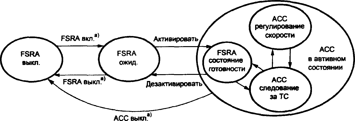 активное состояние FSRA: Состояние, в котором система FSRA регулирует скорость и/или расстояние между транспортными средствами (дистанцию).