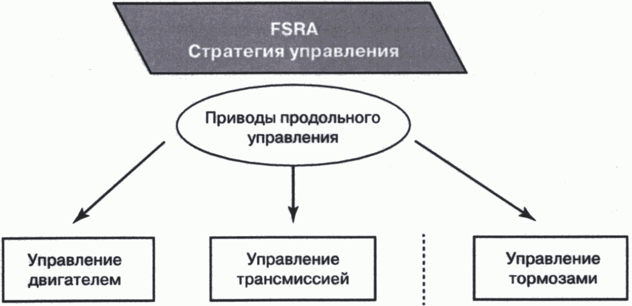 На основе полученной информации контроллер (идентифицированный на рисунке 1 как "Стратегия управления FSRA") посылает команды на исполнительные механизмы для реализации выработанной продольной стратегии управления. Он также передает информацию о состоянии системы FSRA водителю.