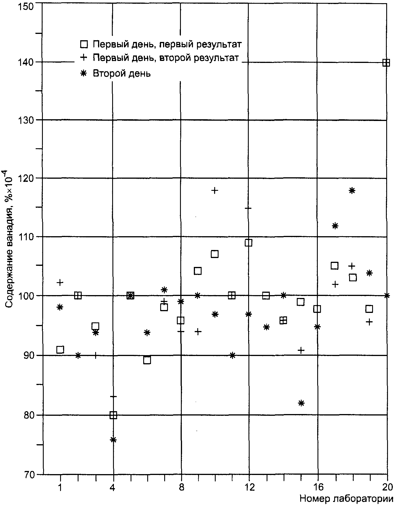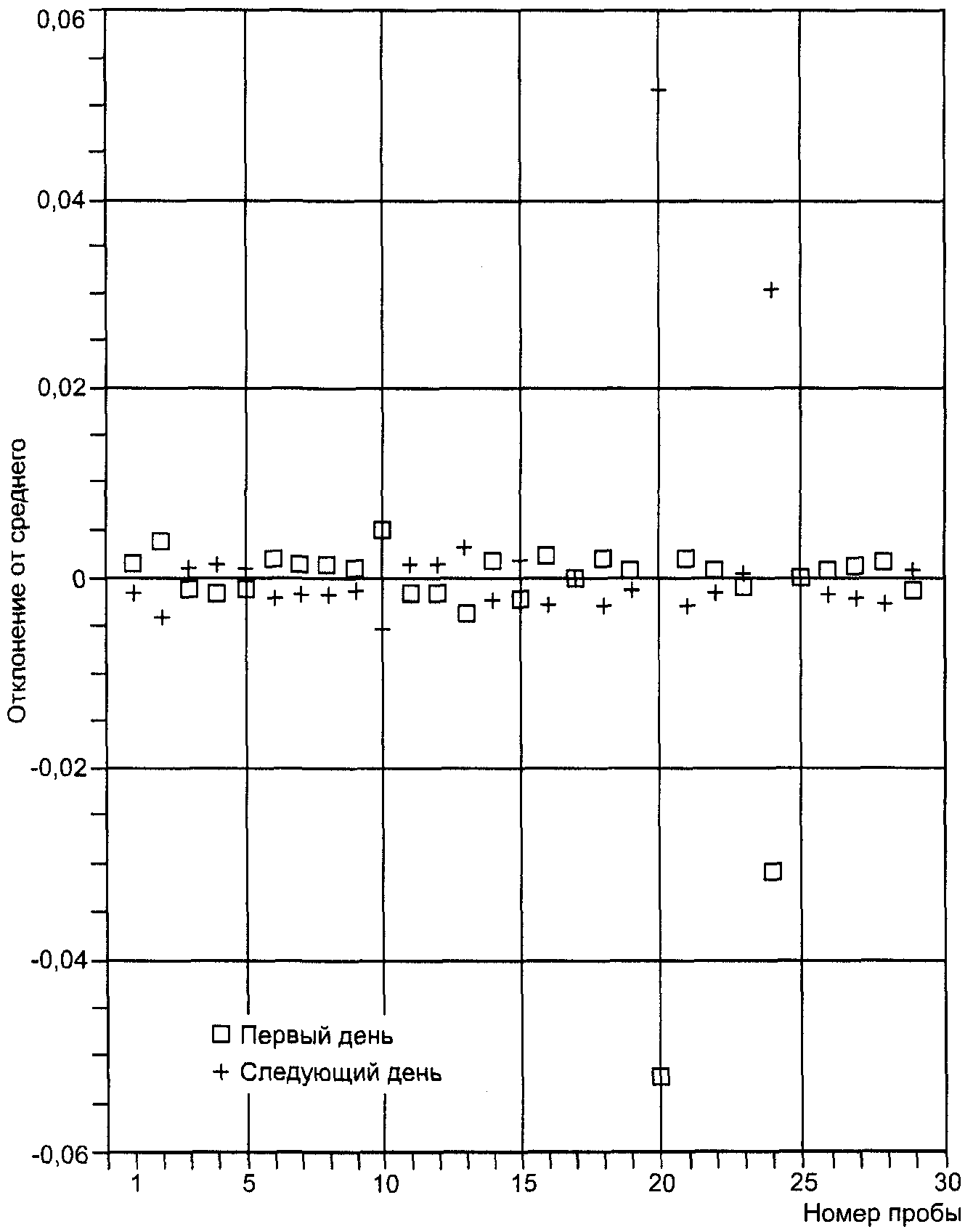 рисунке D.2. Диаграмма свидетельствует о том, что лаборатория 20 - выпадающая. Имеет место большое расхождение между результатом измерений во второй день и средним значением в первый день по сравнению с результатами измерений в других лабораториях. Данная лаборатория была исключена из расчетов показателей прецизионности.