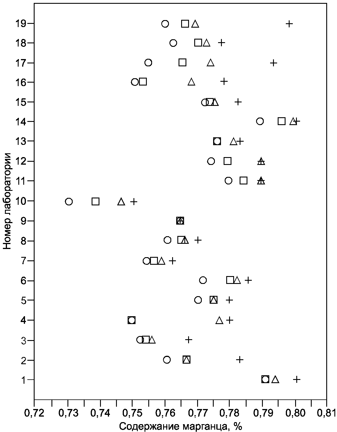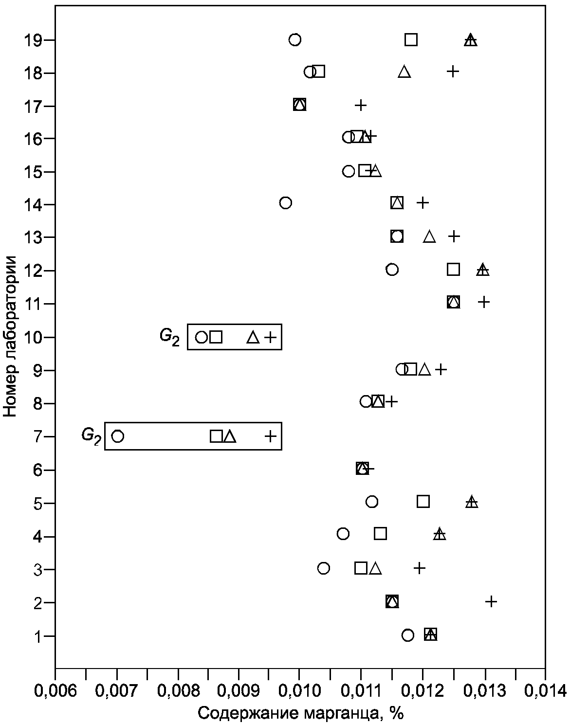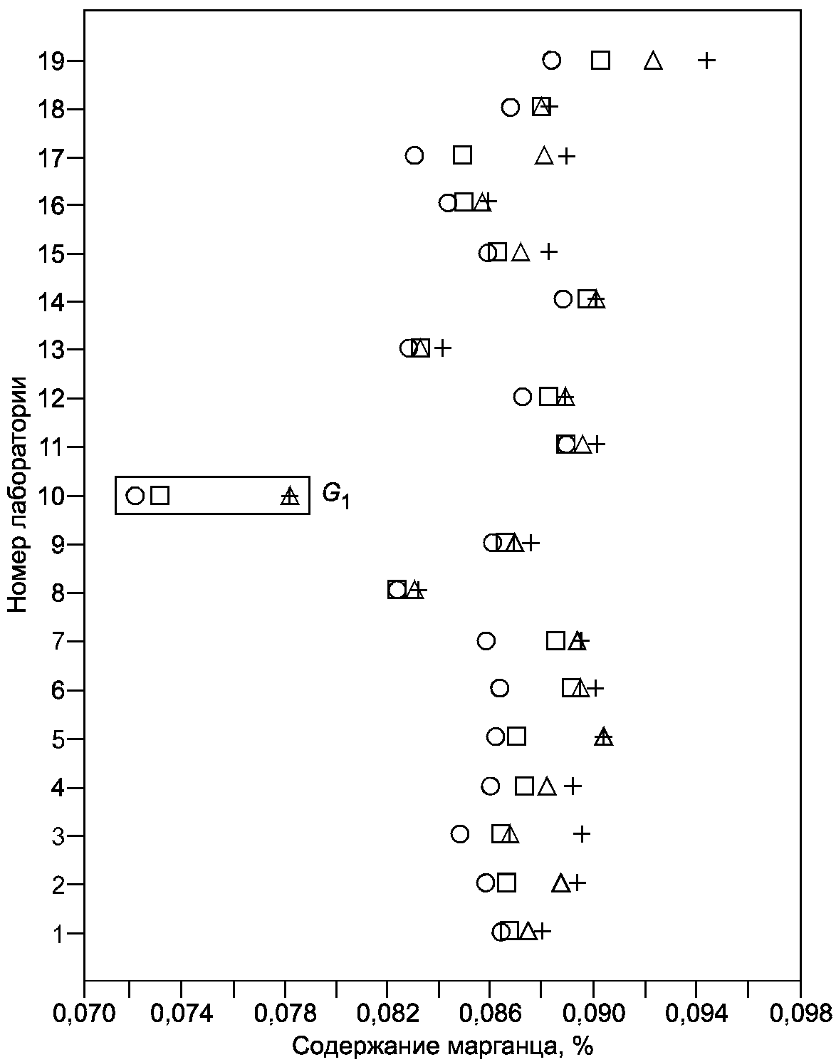 (рисунок B.6) отчетливо свидетельствуют, что лаборатория N 10 получает очень низкие результаты; два из них (уровни 2 и 3) были идентифицированы как выбросы. По этой причине было решено полностью исключить результаты лаборатории N 10; это должно бы стать предметом особого рассмотрения и принятия необходимых мер. Кроме того, были отбракованы данные на уровне 1 в лаборатории N 7, идентифицированные как выброс согласно критерию Граббса. Значения k