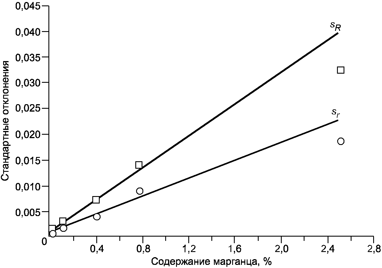 таблице B.5 и представлены в виде графика в функции уровня на рисунке B.8. Рисунок B.8 свидетельствует о том, что имеет место линейная зависимость показателей прецизионности от уровня концентрации, причем соответствующие уравнения линейной регрессии стандартных отклонений повторяемости и воспроизводимости в функции от уровней концентрации выглядят следующим образом: