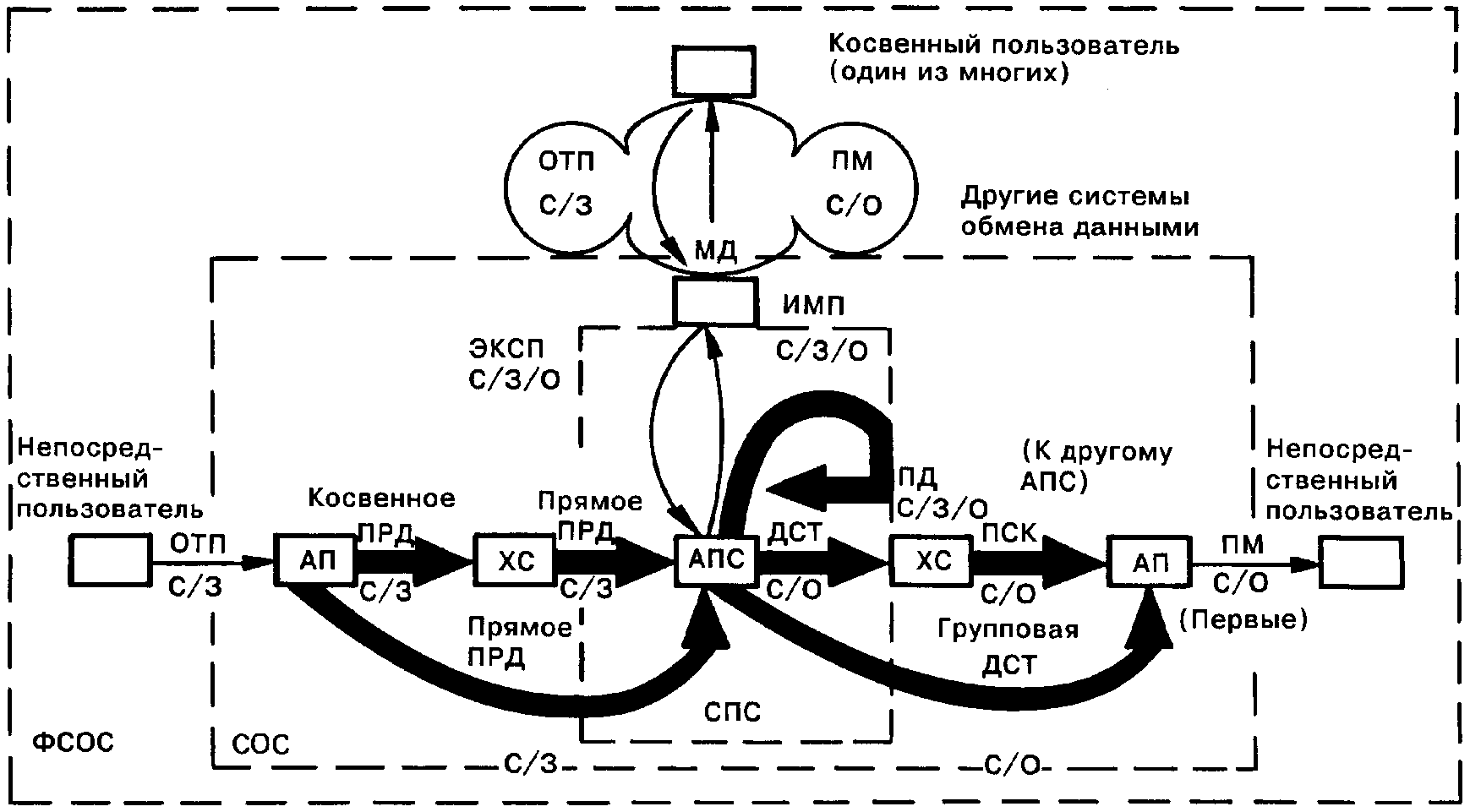 Назначение СОС состоит в том, чтобы дать возможность пользователям обмениваться сообщениями на основе их промежуточного накопления. Сообщение, выданное от имени одного пользователя-отправителя, переносится системой передачи сообщений (СПС) и поступает к агентам одного или нескольких других пользователей-получателей. Модули доступа (МД) связывают СПС с системами обмена данными других видов (например, системами почтовой связи). При подготовке, хранении сообщений и их выводе на дисплей пользователю помогает агент пользователя (АП). Факультативно в хранении сообщений пользователю помогает хранилище сообщений (ХС). Система СПС содержит большое число агентов передачи сообщений (АПС), которые совместно выполняют функцию передачи сообщений с промежуточным накоплением.