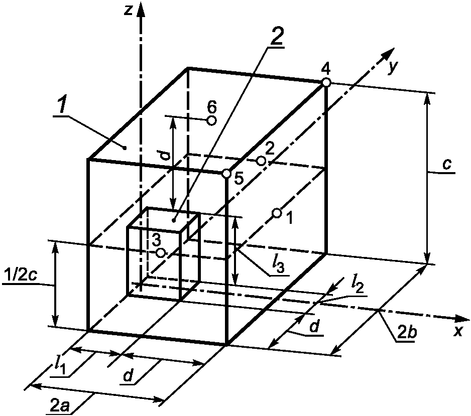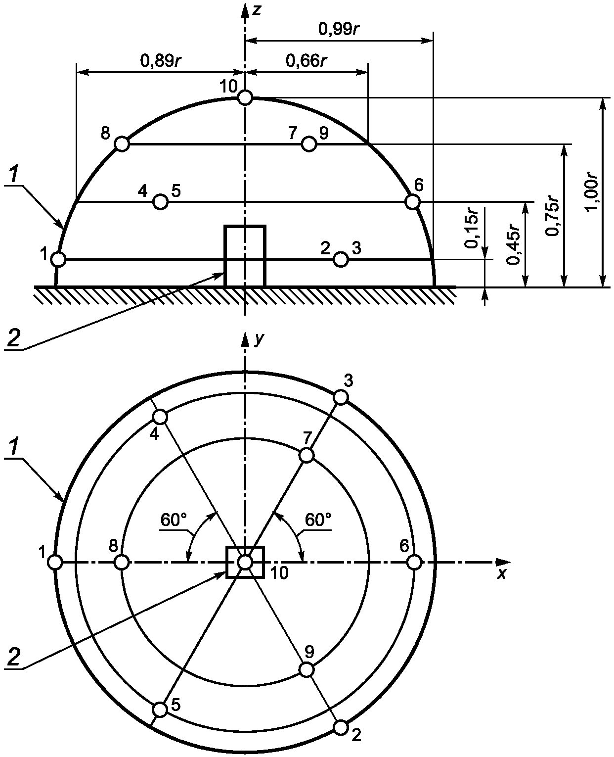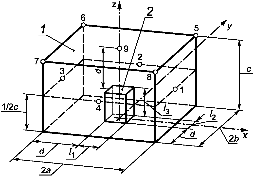 3.6 акустический центр (источника) (centre of location or position of a source): Характеристика испытуемого изделия (бытового электроприбора), определяющая его положение в системе координат, связанной с положением микрофонов, в предположении свободного звукового поля.