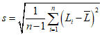 стандартное отклонение выборки s (standard deviation of a sample): Оценка стандартного отклонения по партии (производственной серии)  , выражаемая формулой  . [ИСО 7574-1, статья 3.15] |
