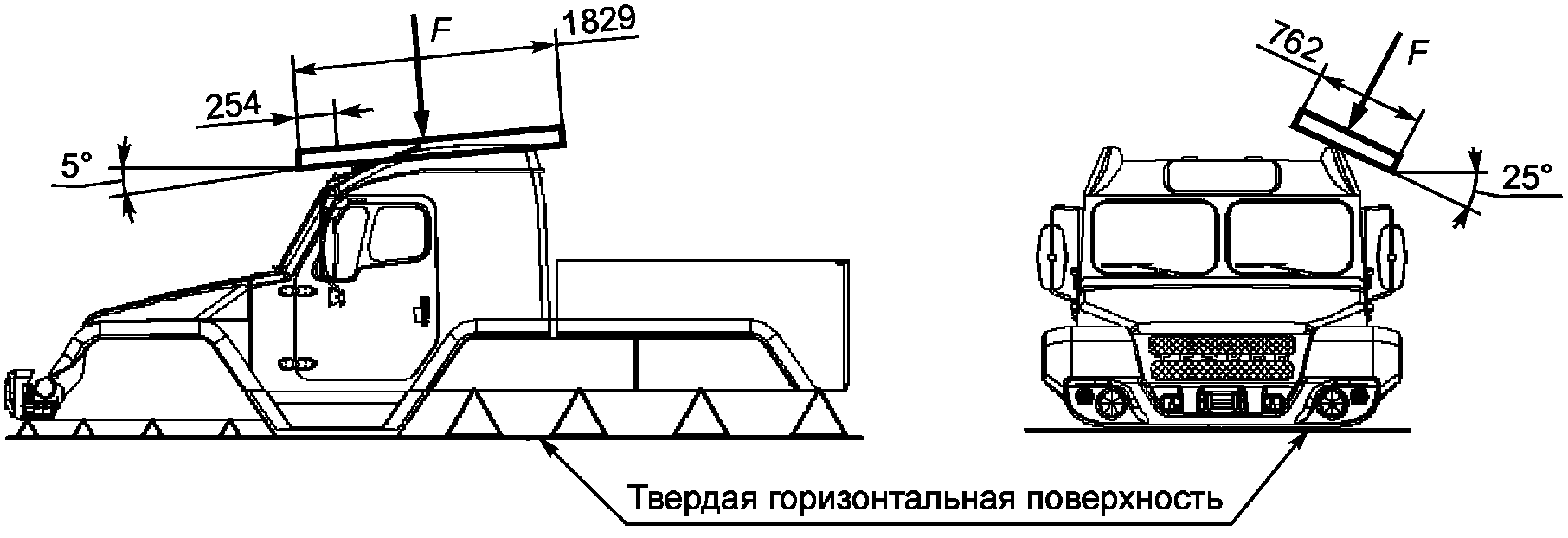 5.3.6. Провести поочередно испытания, нагружая переднюю и боковую кромку крыши кузова/кабины нагружающим устройством, перемещающимся под углами соответственно 5° и 25°, как указано на рисунке 1.