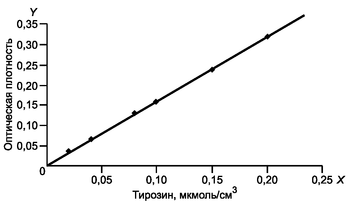 Для построения каждой точки градуировочного графика вычисляют среднеарифметическое значение оптической плотности трех параллельных измерений. По полученным значениям строят градуировочный график зависимости оптической плотности от концентрации тирозина (мкмоль/см3) (рисунок 1).