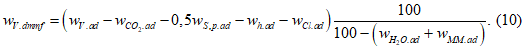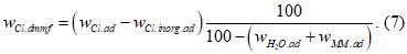 При пересчете содержания хлора с аналитического на сухое без минеральной массы состояние из полученной при анализе величины необходимо вычесть содержание неорганического хлора в соответствии с формулой: