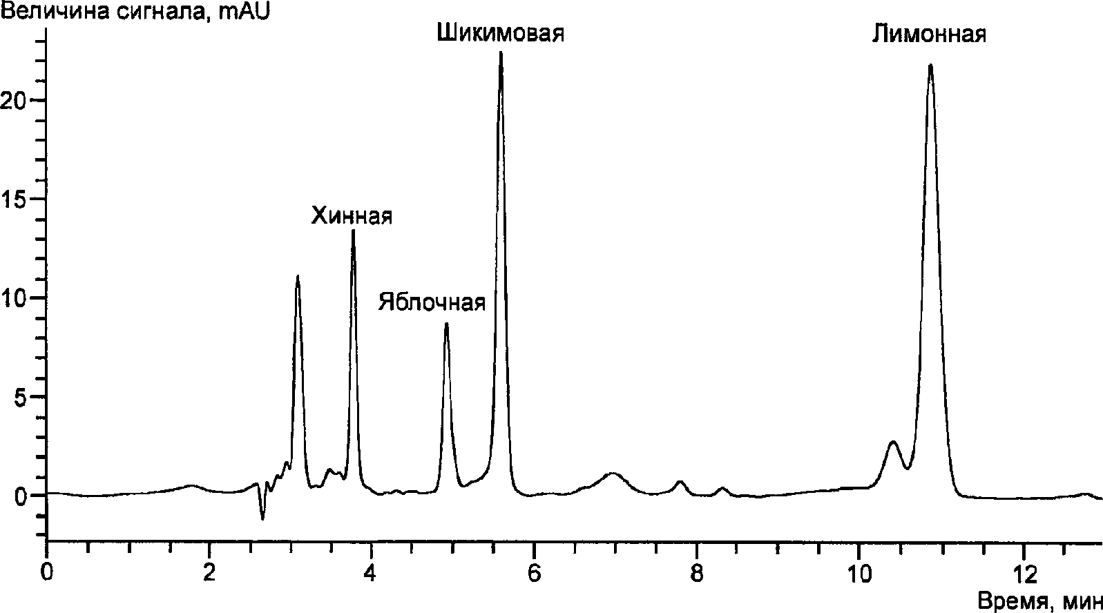 Массовая концентрация кислот на хроматограмме: хинная - 1,2 мг/см3, яблочная - 0,8 мг/см3, шикимовая - 1,8 мг/см3, лимонная - 2,1 мг/см3.