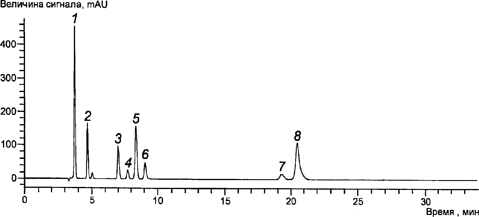 Условия хроматографирования: 0,1 М фосфатный буфер, 2,4 ед. pH, скорость элюирования 1,0 мл/мин.
