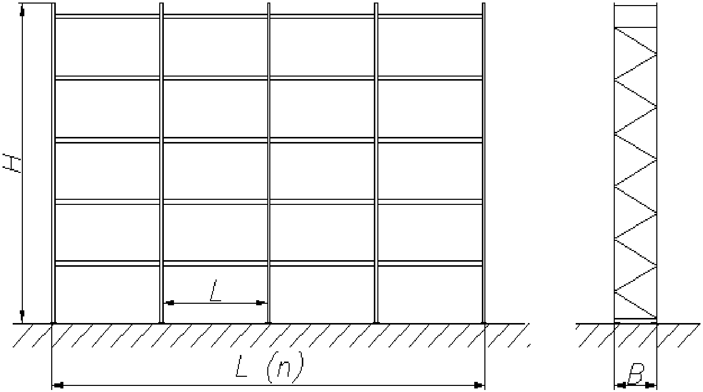 3.10. Раскосная система: конструкция, служащая для связи стоек стеллажа в раму, состоящая из горизонтальных, диагональных раскосов и элементов их крепления.
