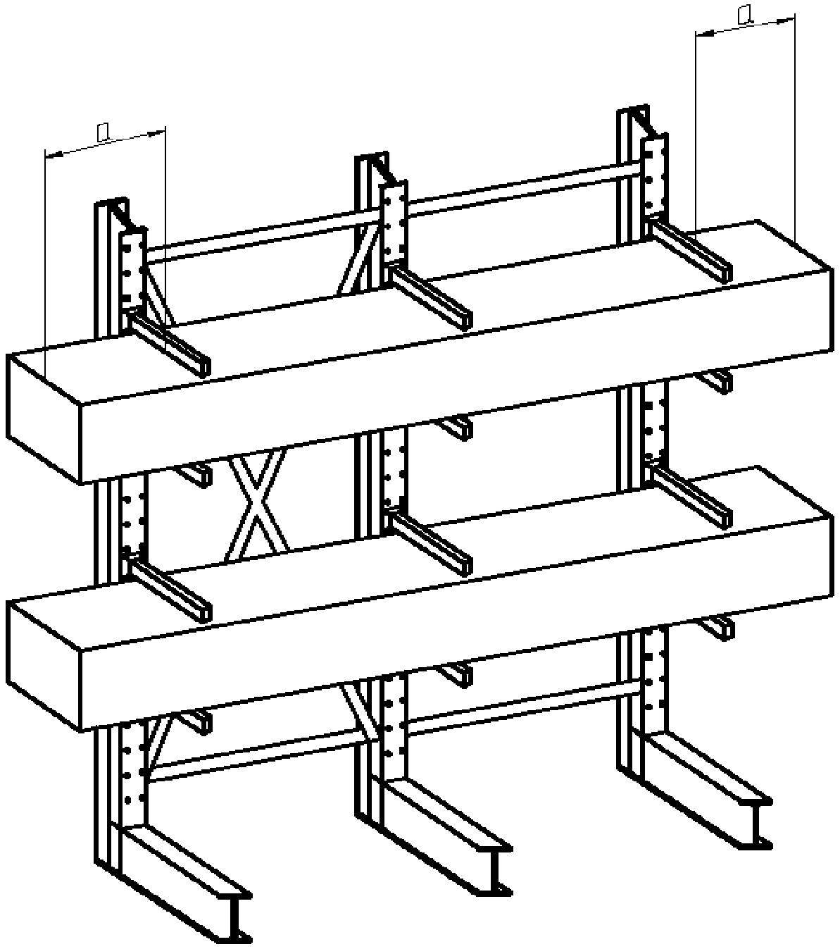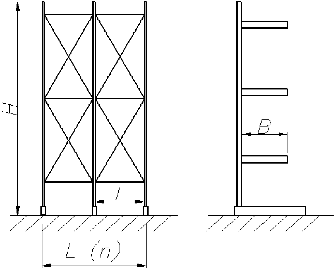3.5. Консольный стеллаж: стеллаж, предназначенный для хранения преимущественно длинномерных грузов, несущая поверхность которого выполнена в виде ряда консолей, прикрепленных к вертикальным стойкам, связанных между собой раскосной системой.