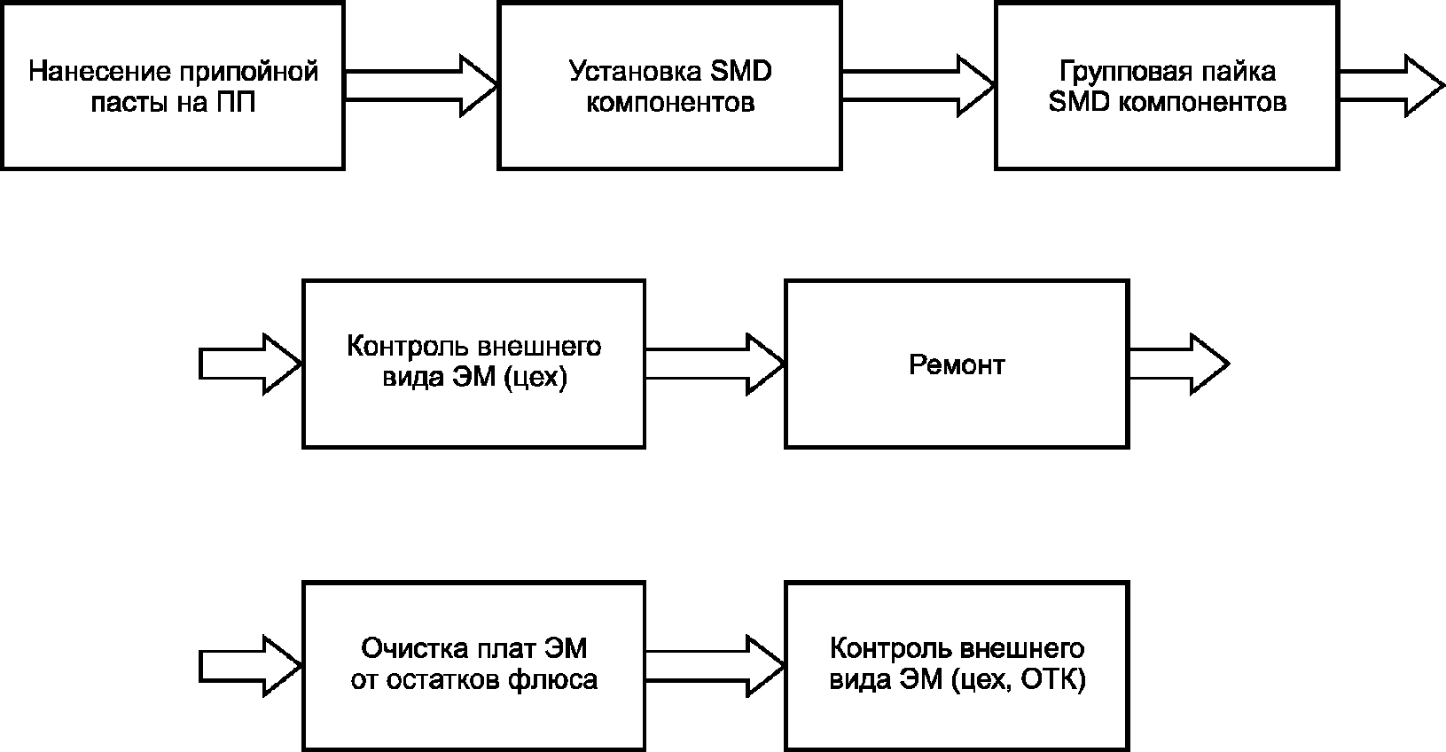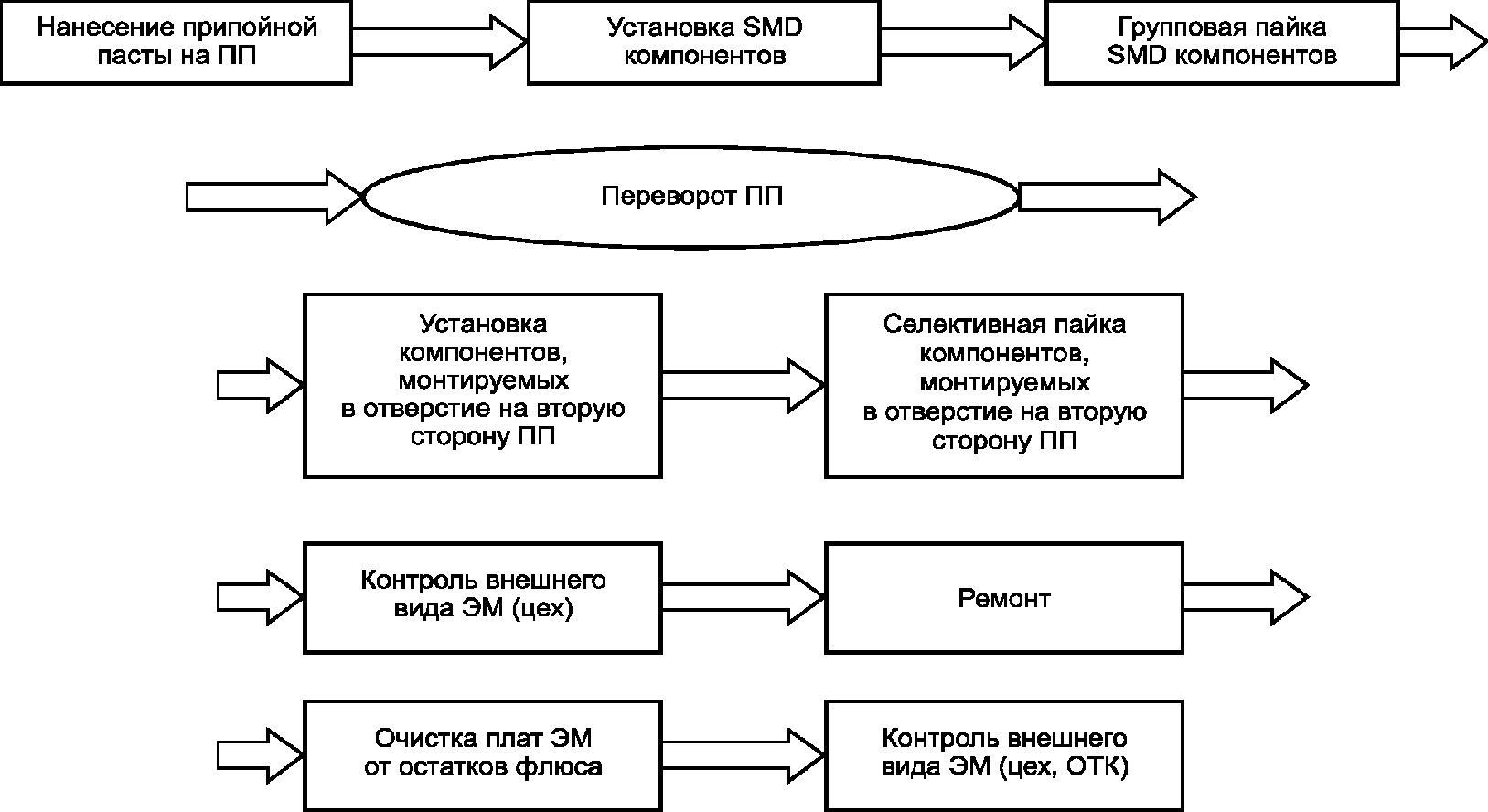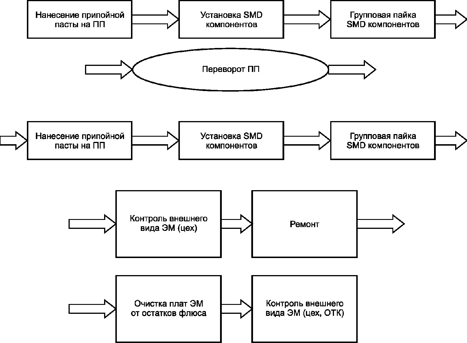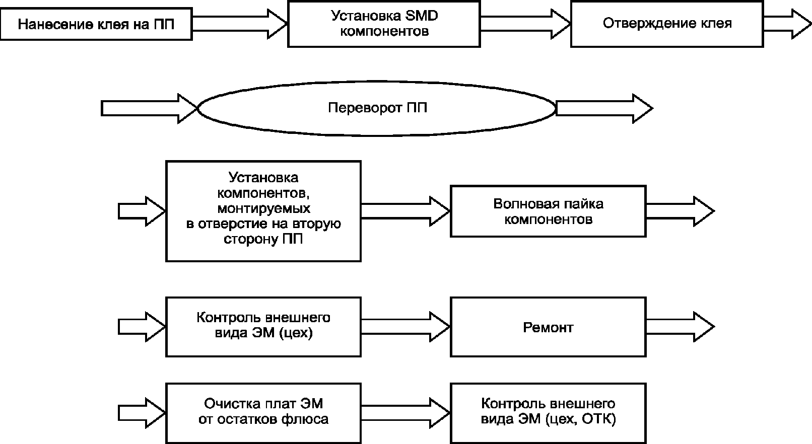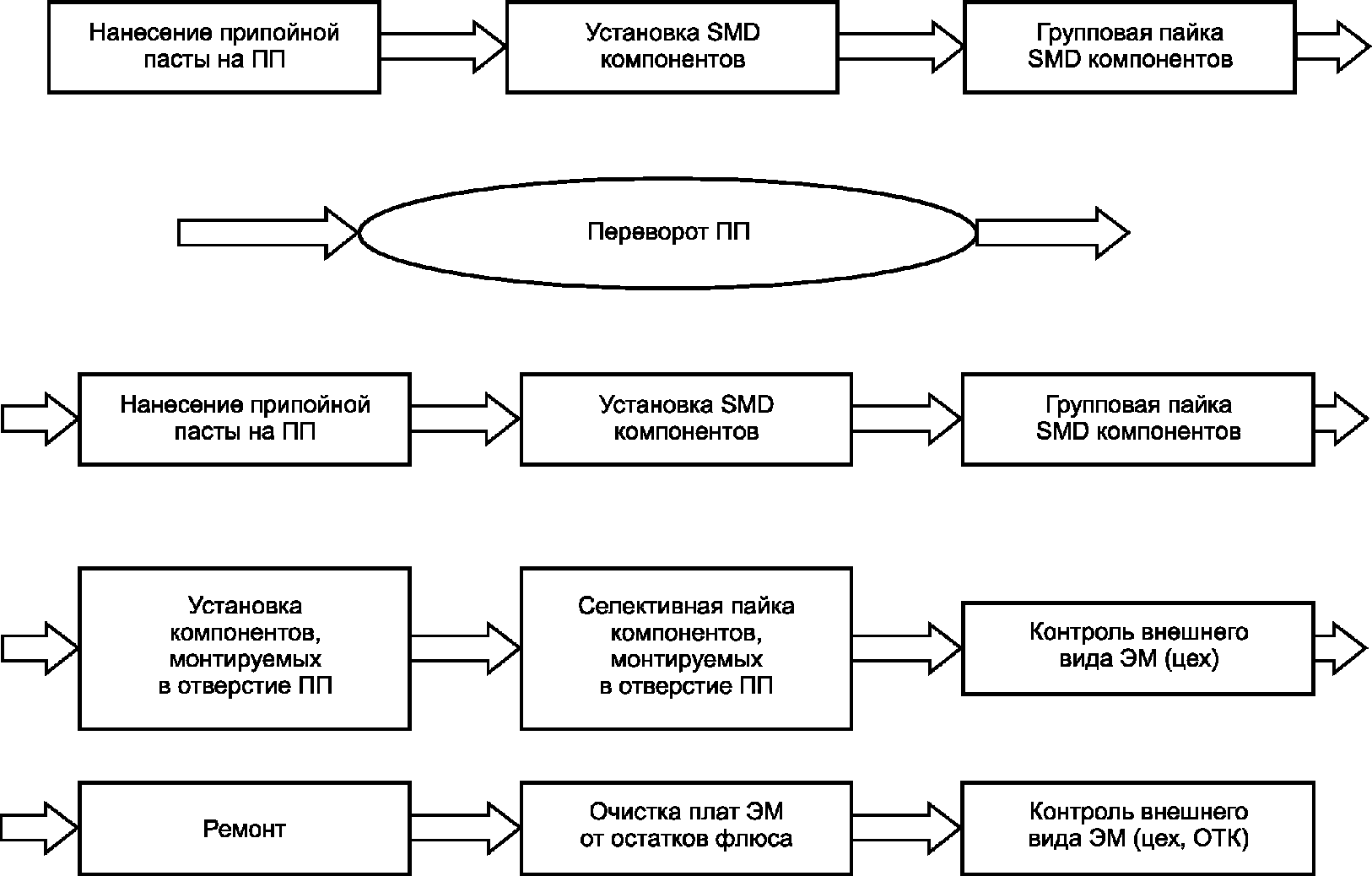 4.3 В зависимости от конструкции печатных узлов и электронных модулей, их области применения и типа используемого оборудования разрабатывается технологический процесс сборки и монтажа. Типовые схемы технологического процесса сборки и монтажа печатных узлов и электронных модулей различных конструкций приведены на