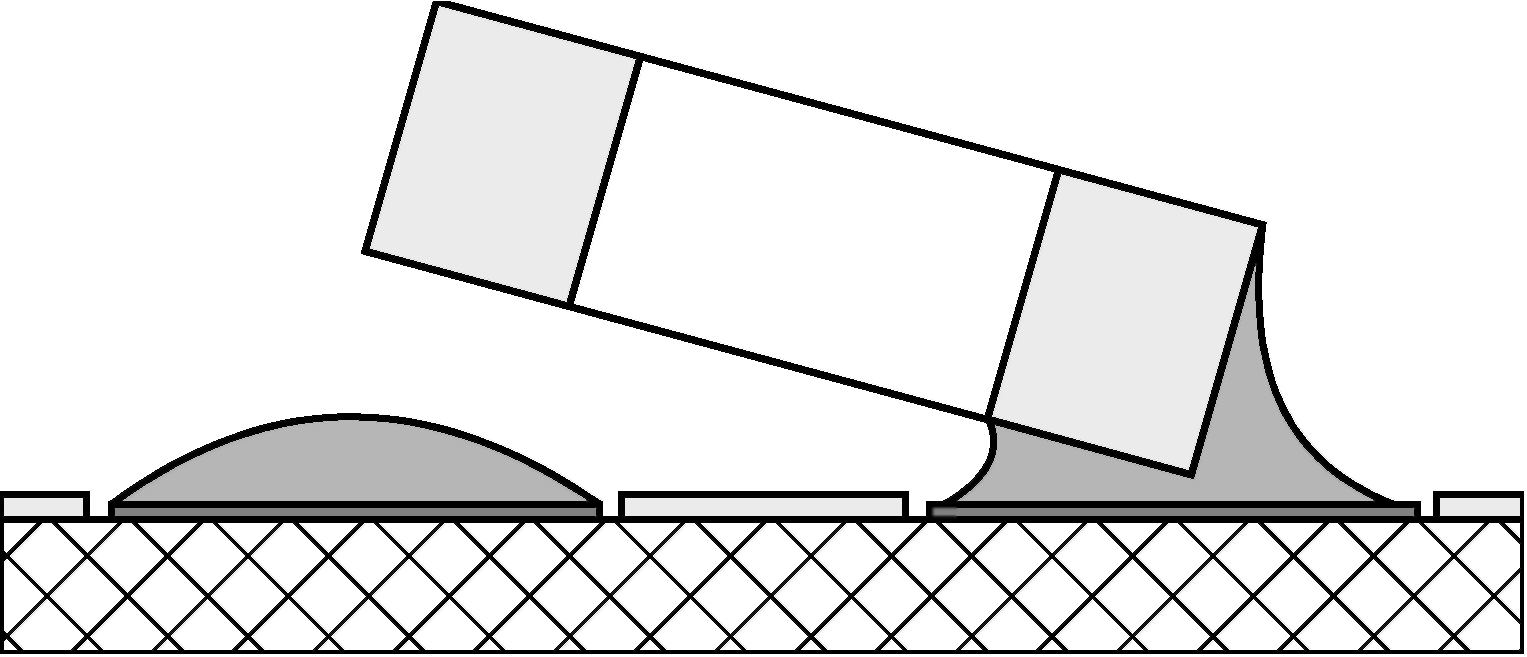 9.3.8.3 Особое внимание необходимо уделять приклейке чип-компонентов и диодов в стеклянном корпусе. Для их фиксации необходимо использовать одну клеевую точку. В противном случае при неблагоприятном стечении всех факторов возможно возникновение дефектов оплавления типа "надгробный камень"