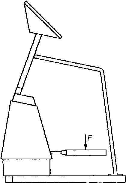 Прикладывают без ударов нагрузку F соответствующего значения для тренажеров классов H и S к площадке размерами 90 x 90 мм на платформе одной педали в течение 5 мин в положении остановки тренажера.