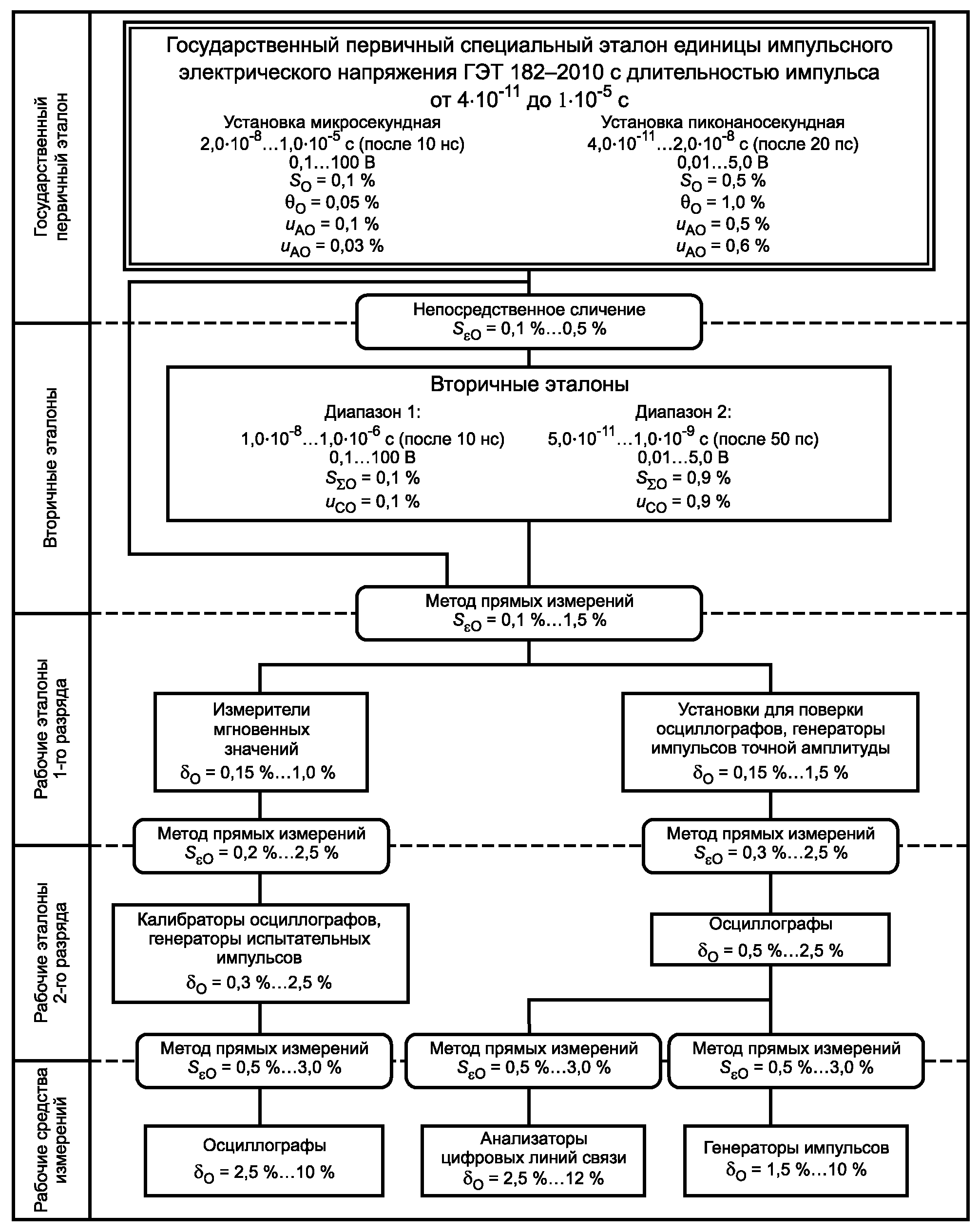 рисунок А.1 (Приложение А)] и устанавливает порядок передачи единицы импульсного электрического напряжения - вольта от государственного первичного специального эталона единицы импульсного электрического напряжения (далее - государственный первичный эталон) с помощью вторичных и рабочих эталонов рабочим средствам измерений с указанием погрешностей и основных методов поверки.