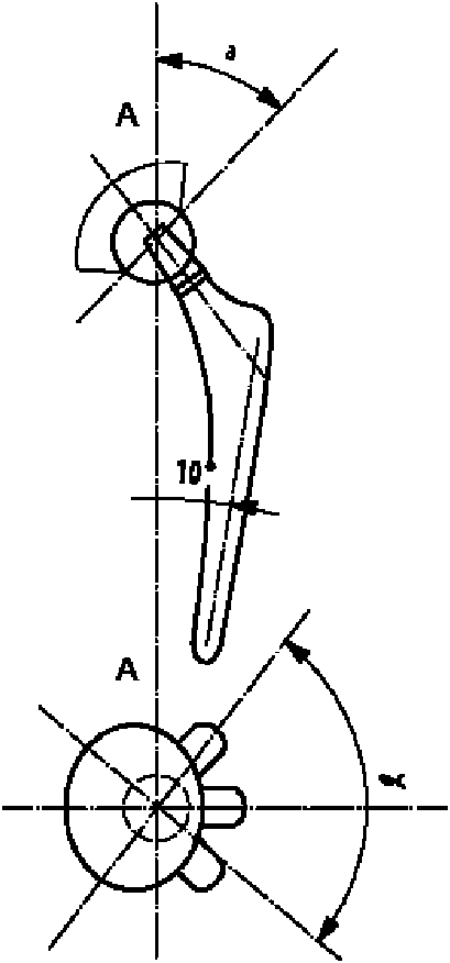 А.2 Закрепляют бедренный компонент, который может иметь интегральную либо модульную конструкцию, на испытательном стенде, так чтобы суставные поверхности бедренного и вертлужного компонентов соприкасались друг с другом и вращались вокруг осей, проходящих через центр суставной поверхности вертлужной впадины. Используя соответствующий гониометр или прибор для измерения углов, перемещают бедренный компонент рукой в плоскости его ножки и шейки до тех пор, пока шейка бедренного компонента соприкоснется с вертлужной впадиной по ее медиальной поверхности, а затем - по латеральной поверхности. Измеряют угол