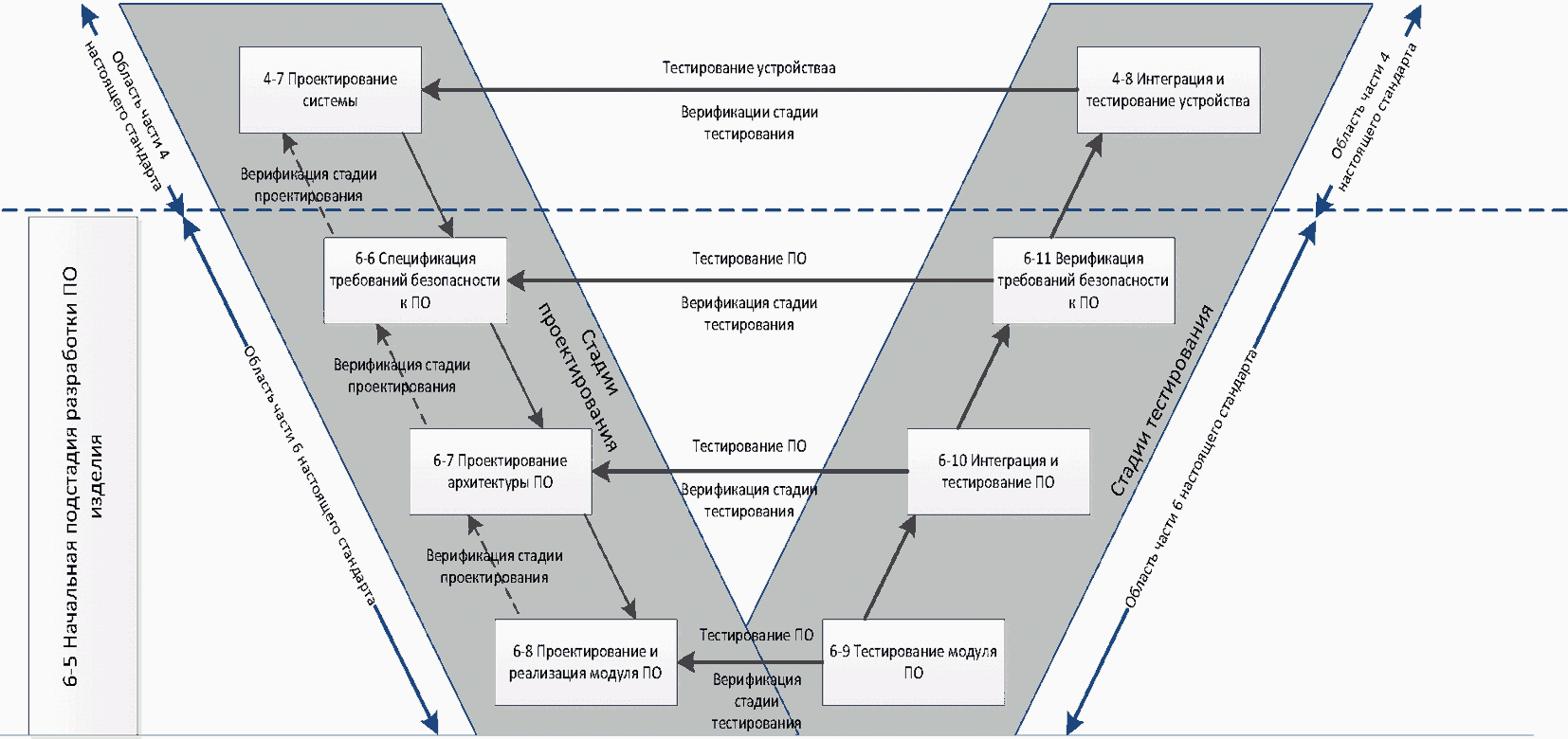 - залитая область в виде символа "V" представляет взаимосвязь между ИСО 26262-3, ИСО 26262-4, ИСО 26262-5, ИСО 26262-6 и ИСО 26262-7;