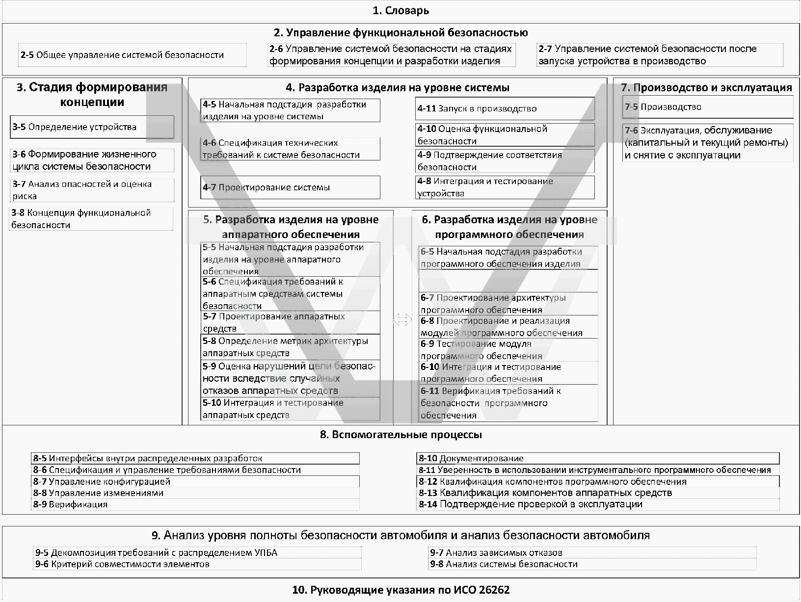 рисунке 1 показана общая структура комплекса ИСО 26262. В нем для различных стадий разработки изделия используется эталонная V-модель процесса. На