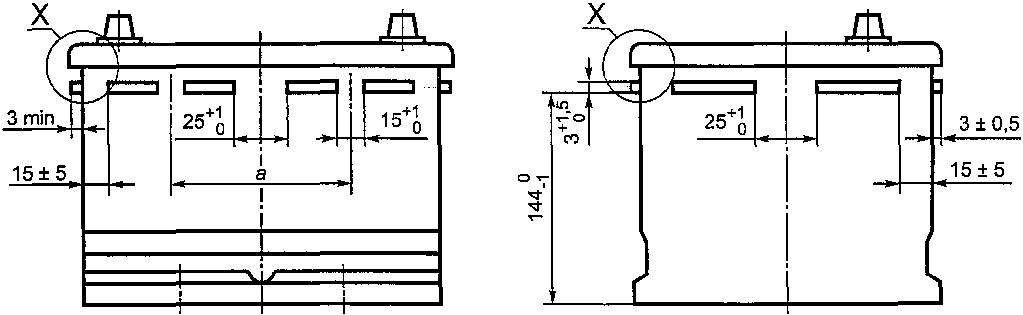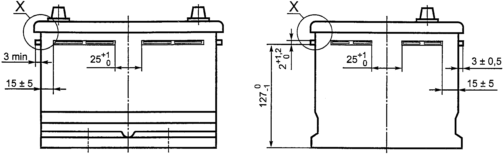 Батареи для крепления по коротким сторонам серий LS, LBS, ES и EBS имеют бортики по дну коротких сторон, образуя неотъемлемую часть бака батареи. Форма и размеры бортиков должны соответствовать рисункам 27a и