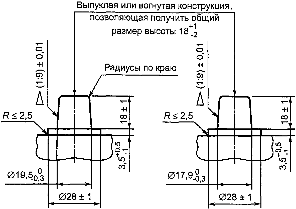 Символы, используемые для маркировки выводов, должны соответствовать символу МЭК 60417-5005 (DB:2002-10) для положительной полярности и символу МЭК 60417-5006 (DB:2002-10) для отрицательной полярности. Символы полярности могут быть или вогнутыми, или выпуклыми на (0,4 +/- 0,1) мм. Размеры показаны на