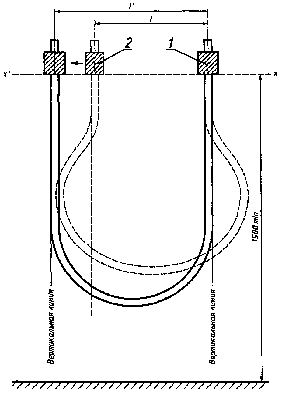 Концы образца закрепляют вертикально (они остаются вертикальными в течение испытания): один конец - в зажиме 1, другой - в подвижном зажиме 2, который должен находиться на расстоянии l = 0,20 м от зажима 1. Кабель принимает приблизительно форму, показанную на рисунке пунктирной линией.