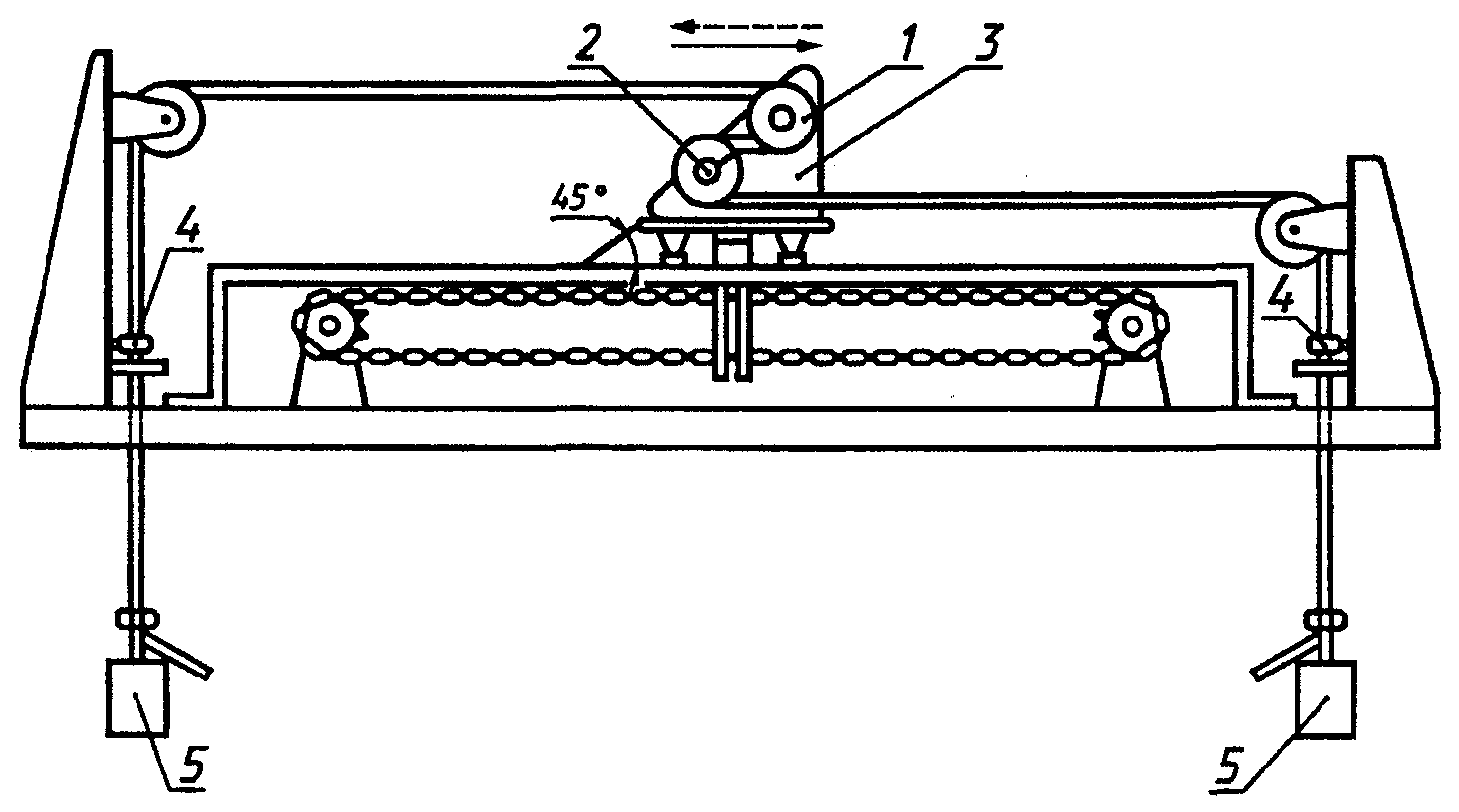 Испытание проводят на стенде, схема которого приведена на рисунке 1. Стенд имеет каретку 3, систему управления движением каретки и четыре ролика для кабеля каждого типоразмера, подлежащего испытанию. На каретке 3 установлены два ролика 1 и 2 одинакового диаметра. Два неподвижных ролика на обоих концах стенда могут иметь диаметр, отличный от роликов 1 и 2, но все четыре ролика установлены так, что образец находится между ними в горизонтальном положении. Каретка совершает цикличное (возвратно-поступательное) движение на участке 1 м с постоянной скоростью около 0,33 м/с при каждом изменении направления движения.
