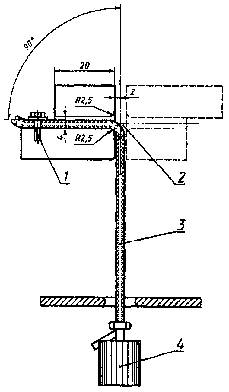 Образец шнура 3 соответствующей длины закрепляют в устройстве 1, приведенном на рисунке 2, и нагружают грузом 4 массой 0,5 кг. По токопроводящим жилам пропускают ток около 0,1 А. Образец изгибают вперед и назад в направлении, перпендикулярном плоскости осей токопроводящих жил, при этом два крайних положения образуют угол 90° по обеим сторонам оси качания 2.
