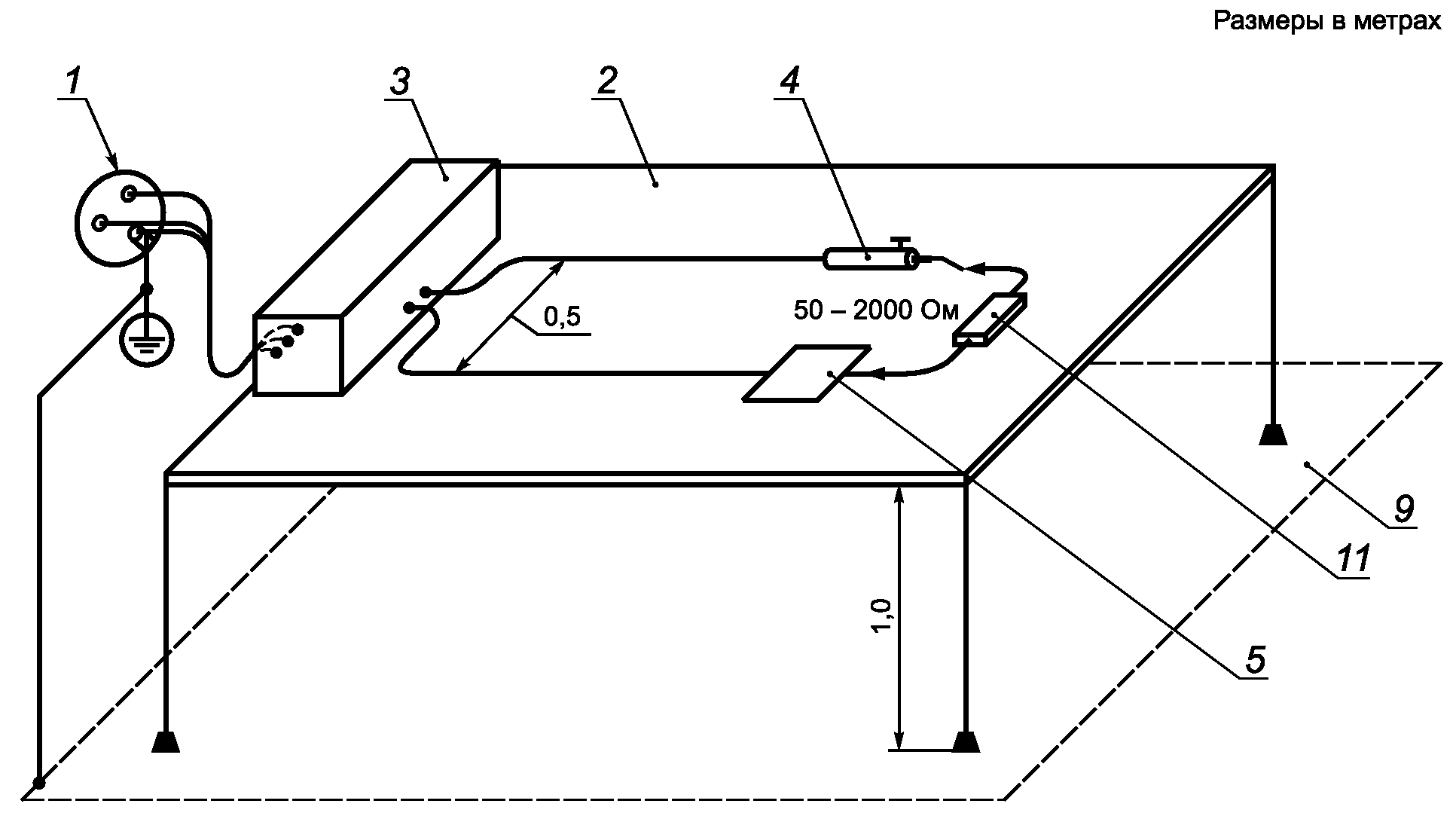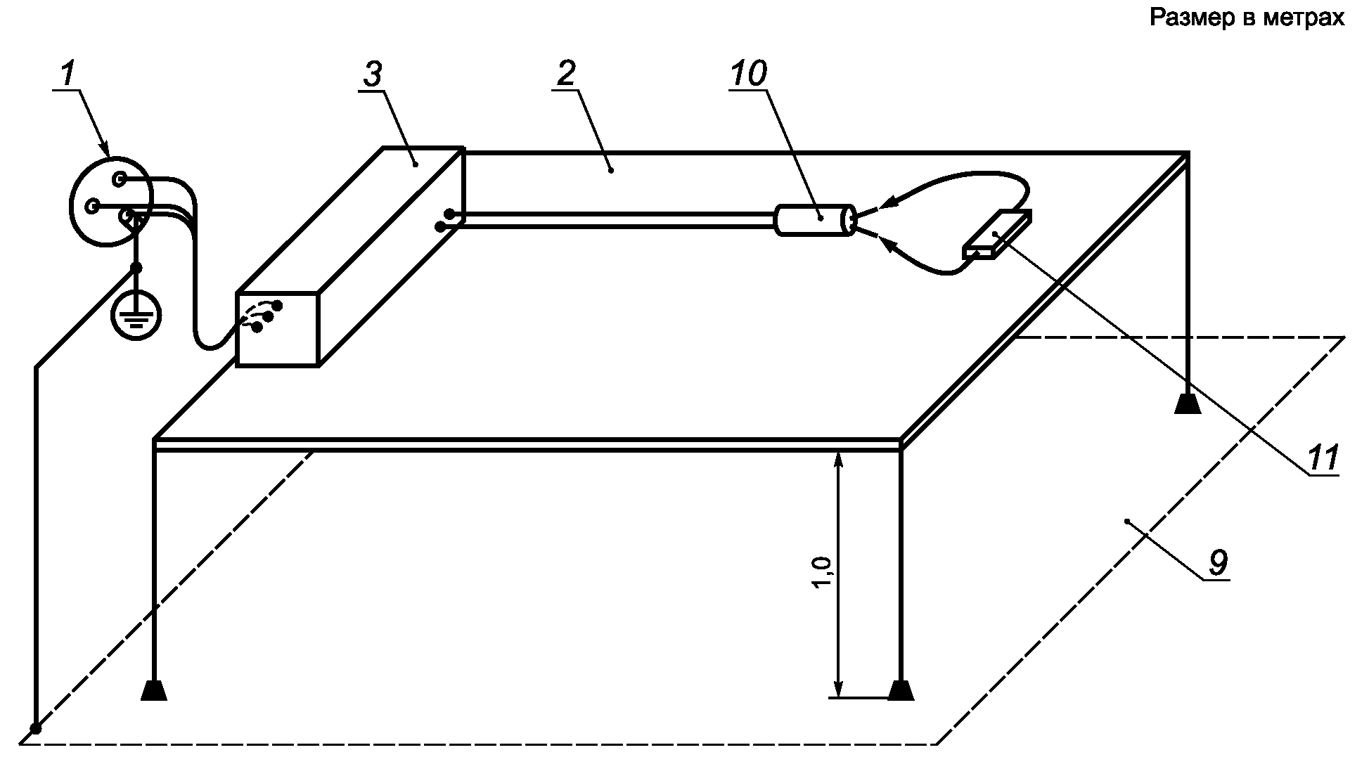 6 - непроводящий стол; 7 - антенна - расстояние 10 м,