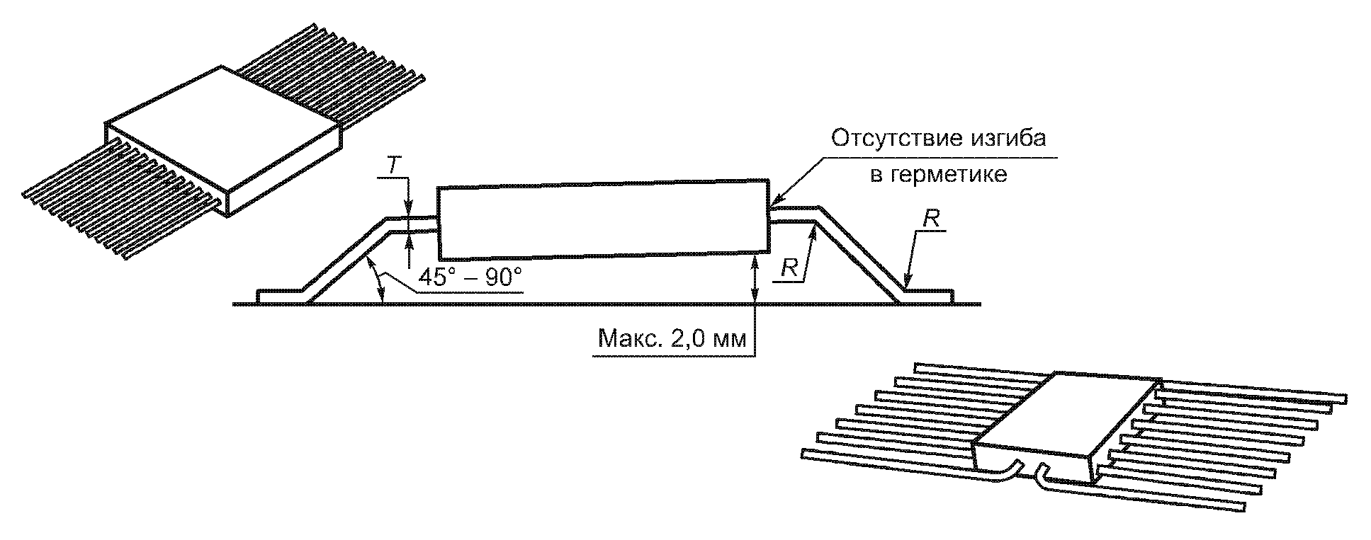 Во время формовки выводы должны закрепляться для защиты места заделки вывода с корпусом. Изгибы не должны заходить в место заделки (см. рисунок 1). Радиус изгиба вывода R должен быть более 1T (где T - номинальная толщина вывода). Угол части вывода между верхним и нижним изгибами относительно монтажной площадки должен быть: минимальный - 45°, максимальный - 90°.