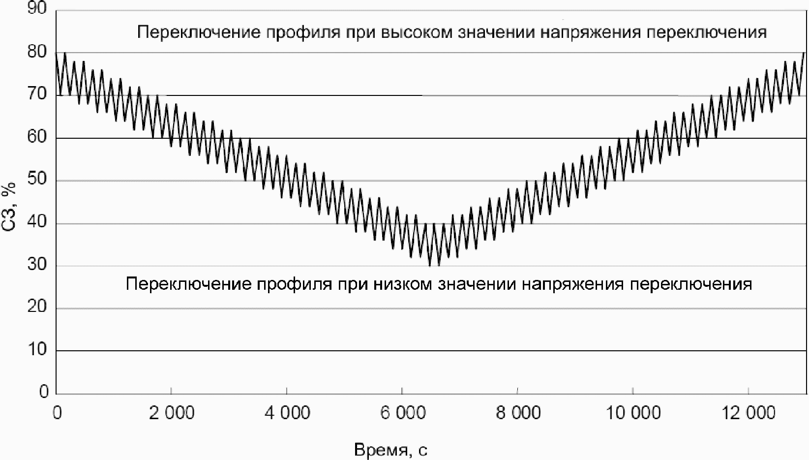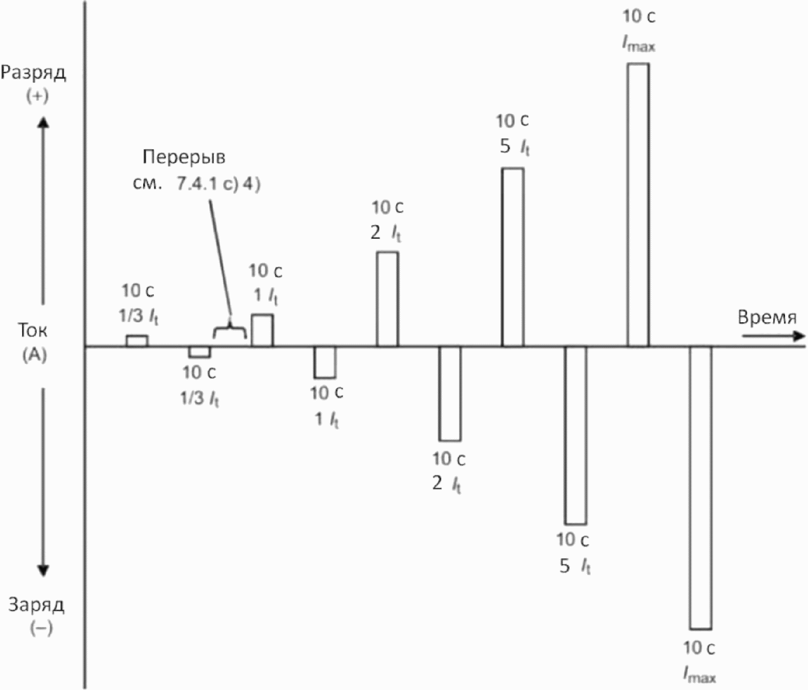 t x 10 с. Используют стандартный интервал измерений 1 с. Если значение напряжения батареи после 10 с выходит за границы нижнего предела напряжения при разряде или верхнего предела напряжения при заряде, то испытания проводят при пониженном значении тока по