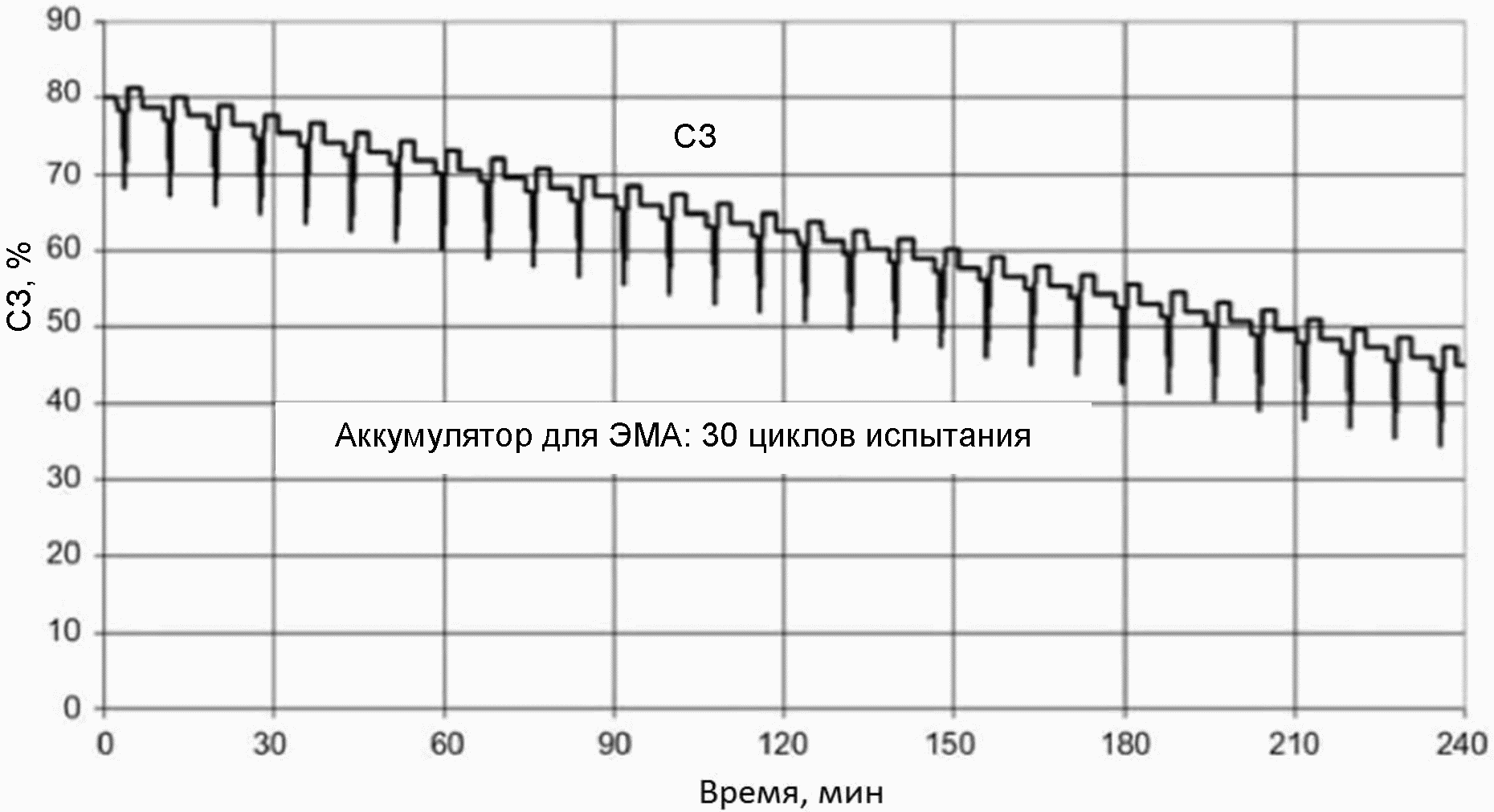 На рисунке 5 показано изменение степени заряженности за все время испытания аккумулятора, предназначенного для применения в ЭМА.