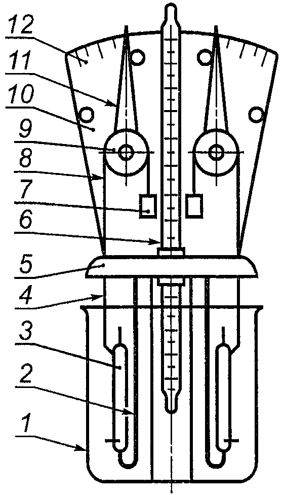 10 - вертикальная стойка, 11 - подвижная стрелка, 12 - шкала