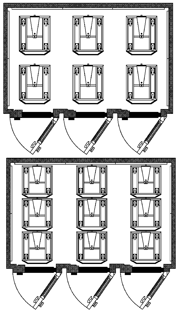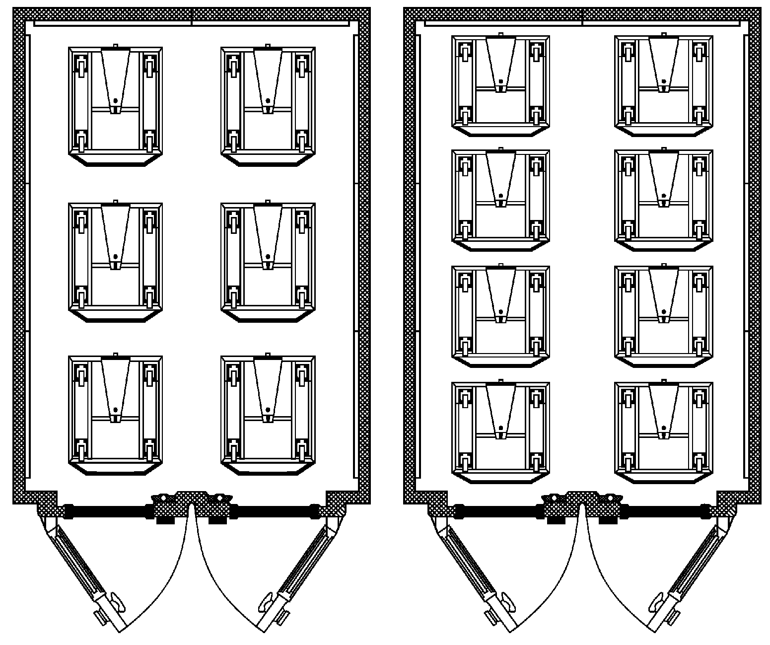 | Приложение 4 (справочное). Пример схемы размещения шести и восьми тележек в шкафу для расстойки тестовых заготовок |