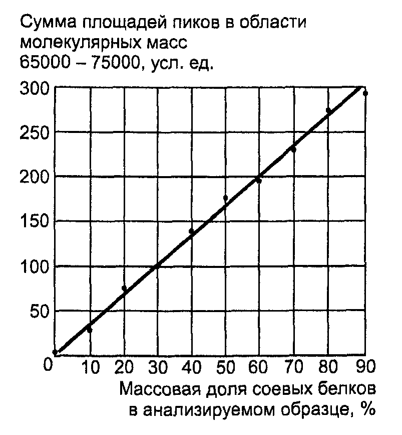 Сумма площадей пиков, соответствующих белковым зонам с молекулярными массами 65000 - 75000, пропорциональна содержанию соевой добавки в мясе и мясных продуктах.