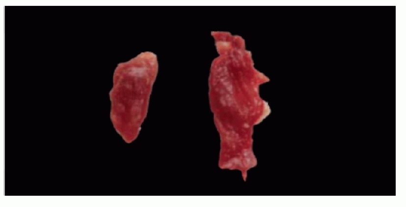 Малое филе, без выступающей части сухожилия получают путем отделения глубокой грудной мышцы от грудки и грудной кости; выступающая часть сухожилия удалена; состоит из одной целой мышцы с внутренним сухожилием без выступающей его части.