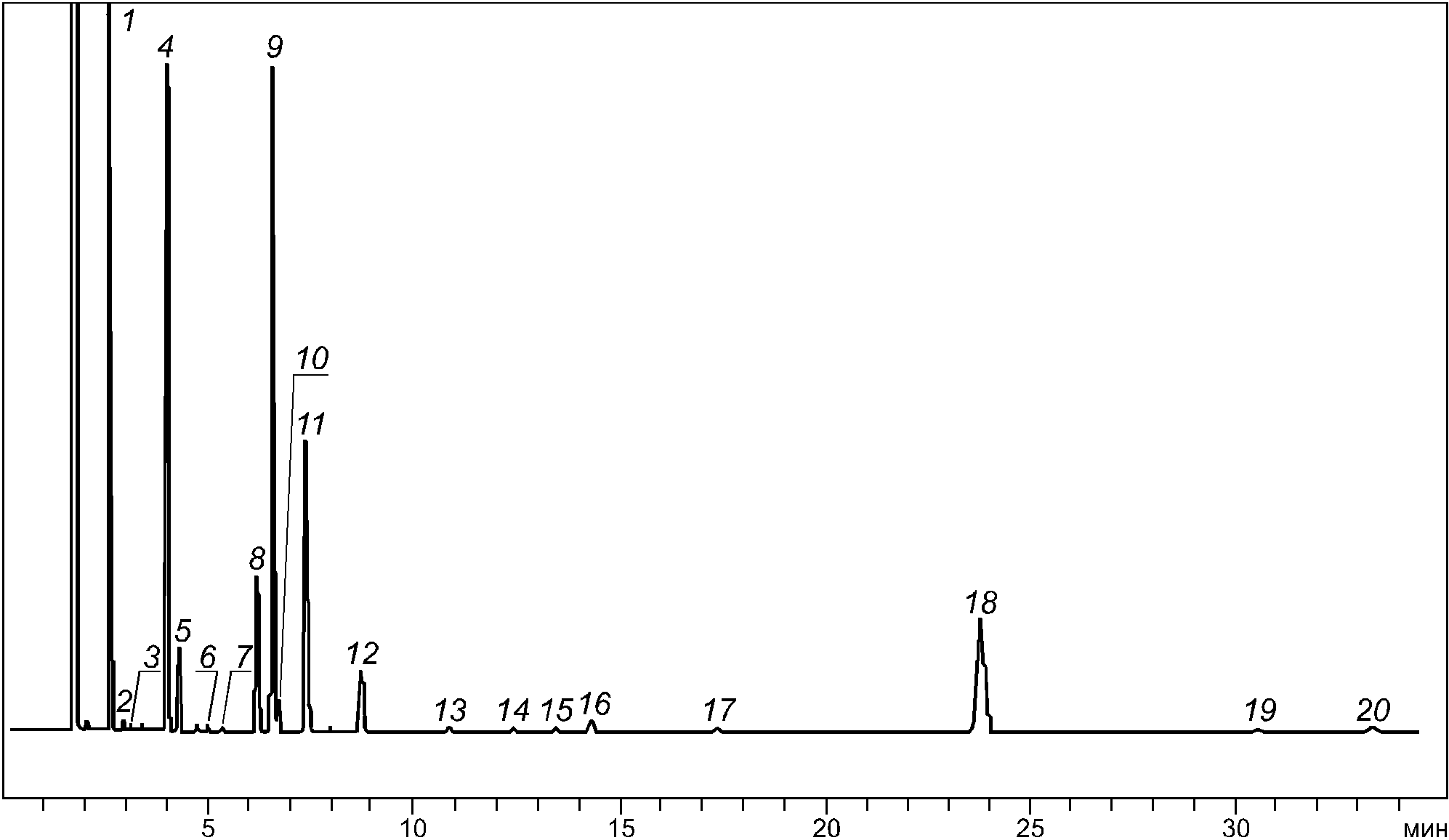 Примечание - В обозначении цис-ненасыщенных жирных кислот вместо n используют также букву w, соответственно к омега-3 и омега-6 жирным кислотам относятся кислоты, обозначенные соответственно как n3 и n6. Кроме перечисленных жирных кислот, на хроматограммах могут наблюдаться хроматографические пики между пиками C18:3 и C20:0, относящиеся к смеси изомеров конъюгированной линолевой кислоты (10,12-C18:2 и 9,11-C18:2). |