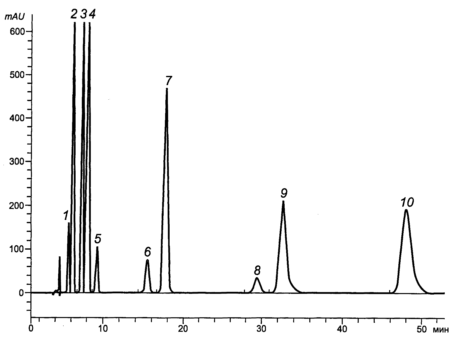 Готовят контрольный раствор, содержащий ацесульфам калия, аспартам, сахарин, 5-бензил-3,6-диоксо-2-пиперазинуксусную кислоту (дикетопиперазин), аспартилфенилаланин, фенилаланин, кофеин, сорбиновую и бензойную кислоты, теобромин, оксиметилфурфурол и ванилин.