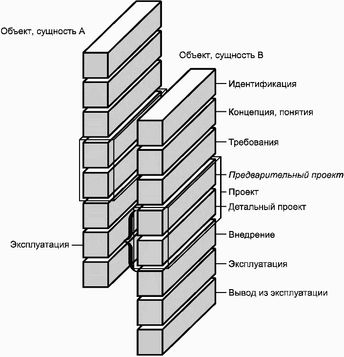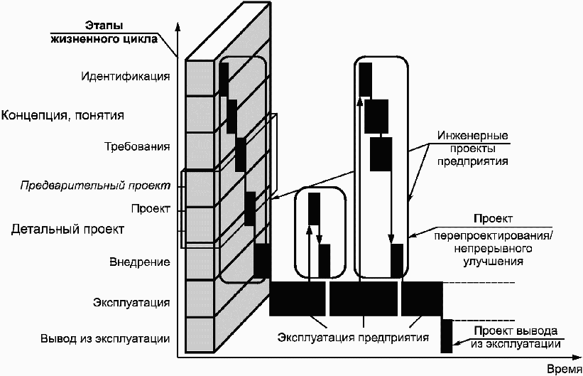 Представляется возможным провести четкое различие между этапами жизненного цикла, которые распространяются на создание и модификацию (их разработку, проектирование, строительство и т.д.) и эксплуатацию производственных объектов. Такое различие дает возможность осуществить упорядоченный переход от инжиниринговой среды к операционной, обеспечивая проведение валидации, испытаний и получение результатов инжиниринга до функционирования.