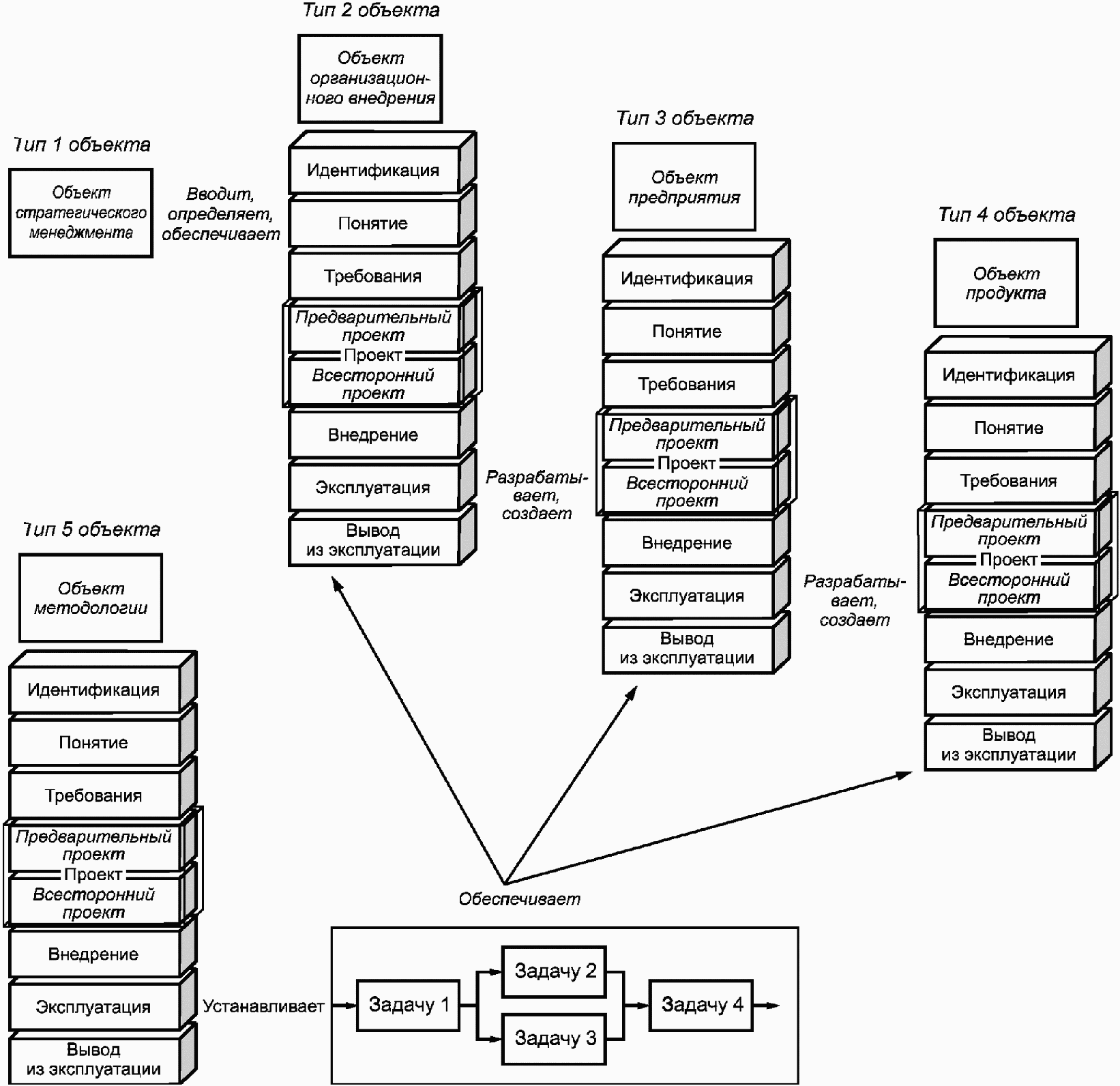 Область применения стандартных архитектур предприятия и методологий распространяется на следующие составные части, обязательные для выполнения всех типов проектов по созданию предприятий, а также на любые изменяющиеся проекты, необходимые в течение всего срока жизни предприятия, включая: